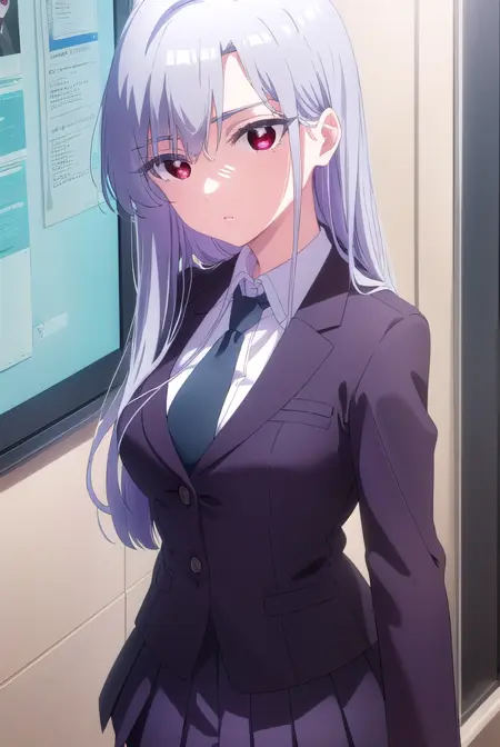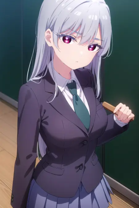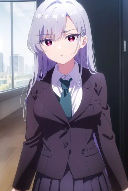 nano eiai, 긴 머리, 앞치마, 눈 사이의 머리카락, (빨간 눈:1.3), 회색 머리,