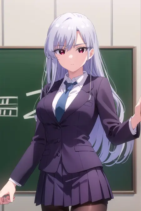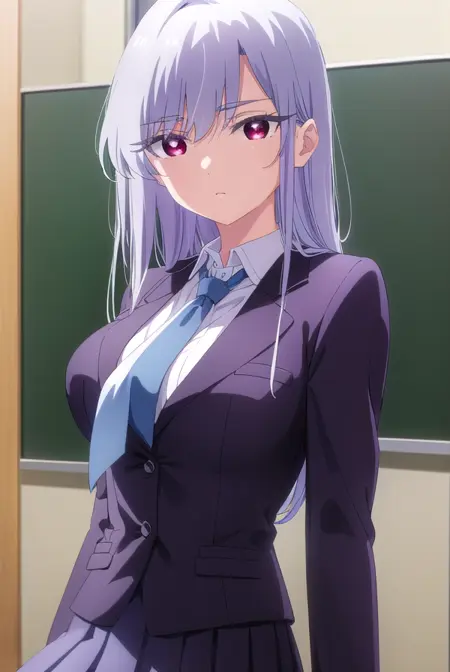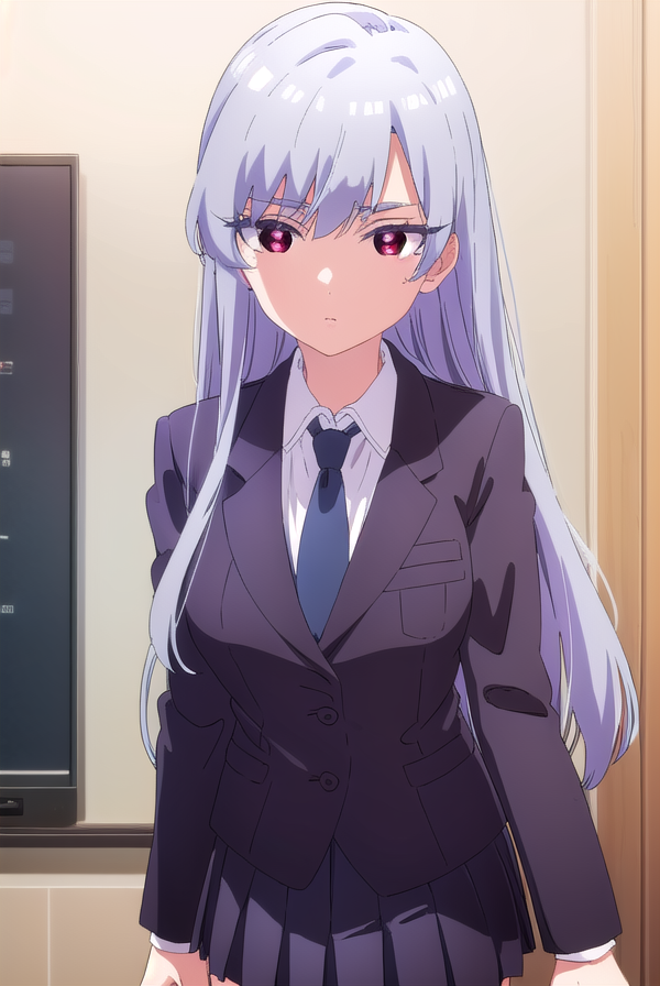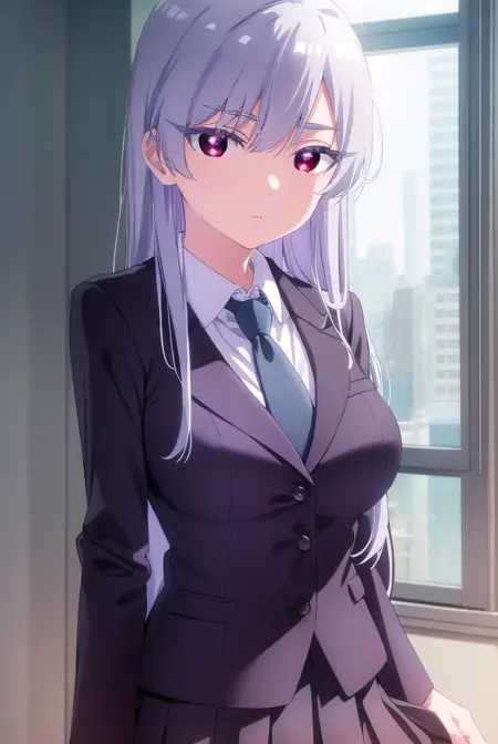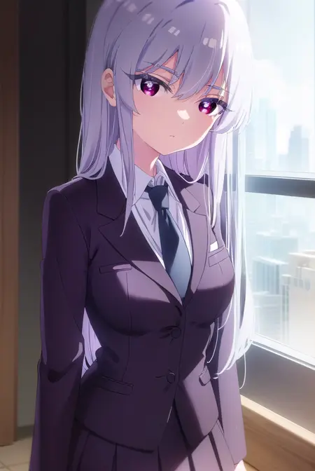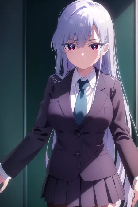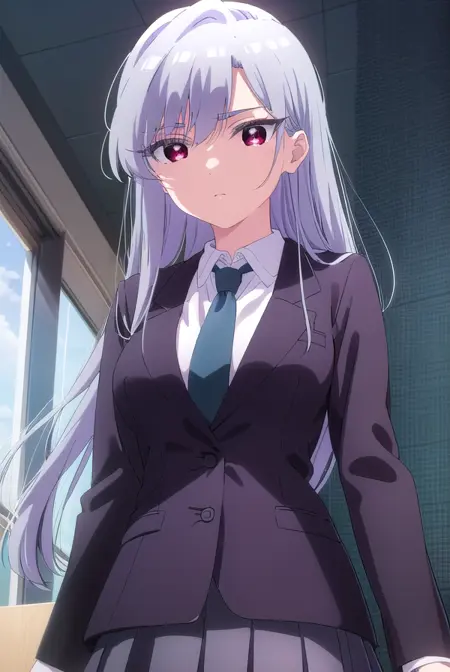 nano eiai, long hair, bangs, hair between eyes, (red eyes:1.3), grey hair,