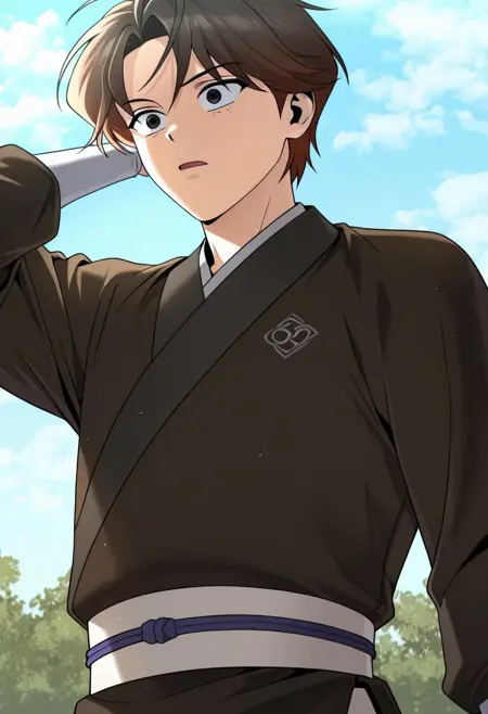 1boy, male focus, solo brown eyes, brown hair, dobok, brown dobok, obi, white pants, boots, brown footwear,