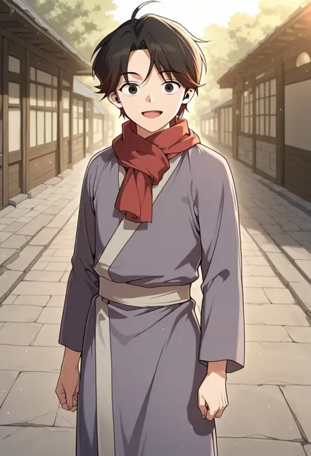 1boy, male focus, solo brown eyes, brown hair, grey robe, red scarf, waist sash, grey pants, bandaged legs, brown footwear,