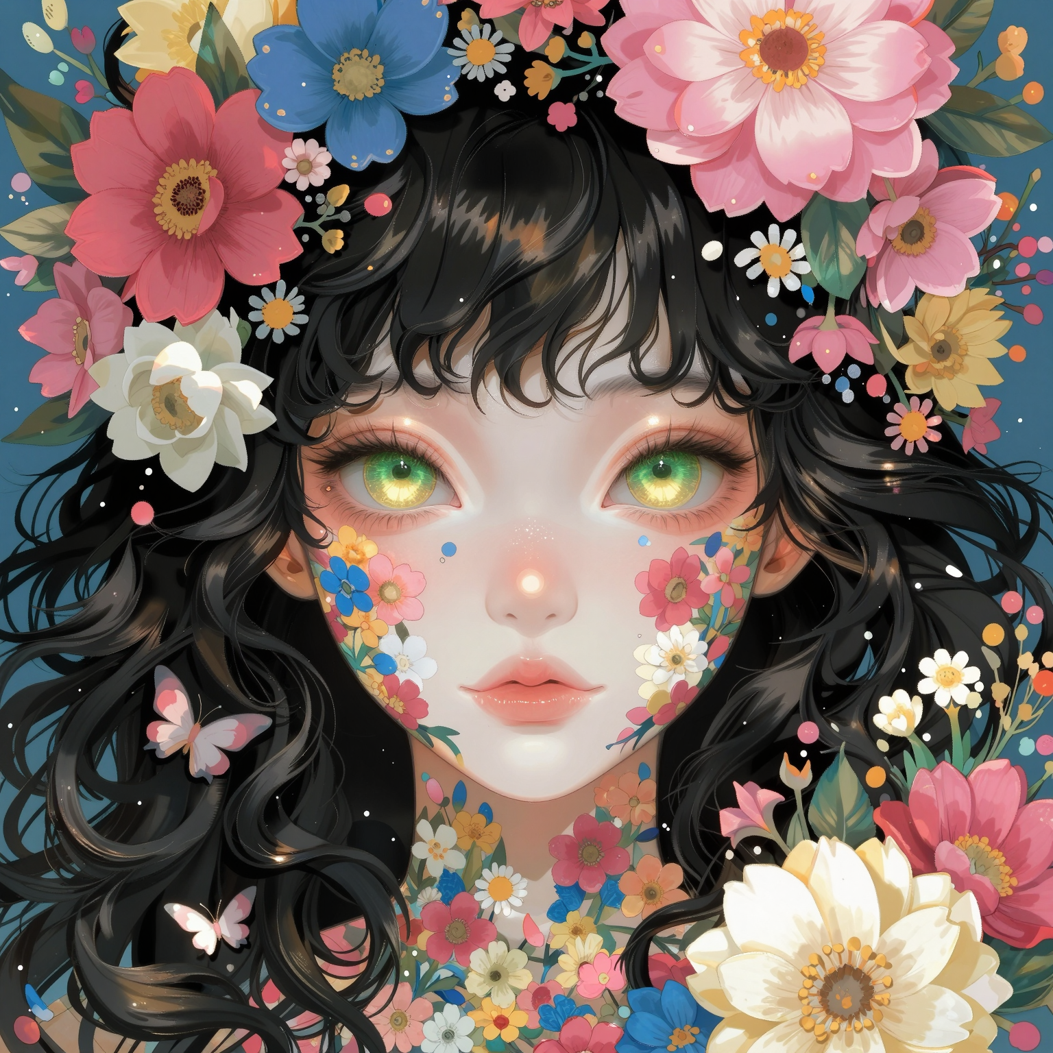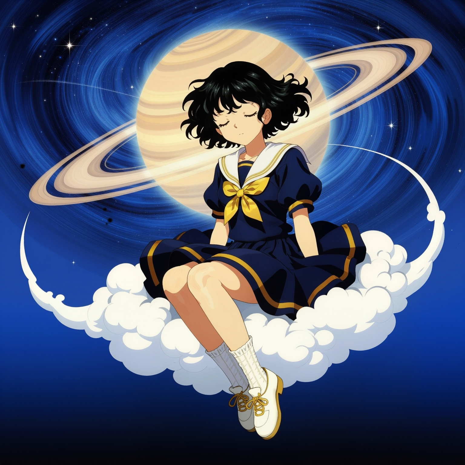 角色们仿佛被命运轻抚:身披飘落和服花瓣的战士,心口闪烁霓虹的静默乐手,蜷缩在天穹金辉下的天使,以及捧着拉面、仿佛整个宇宙都盛于碗中的少女,还有坐在不可能的蔚蓝天空下沉思的梦者。