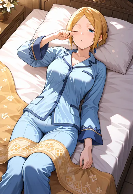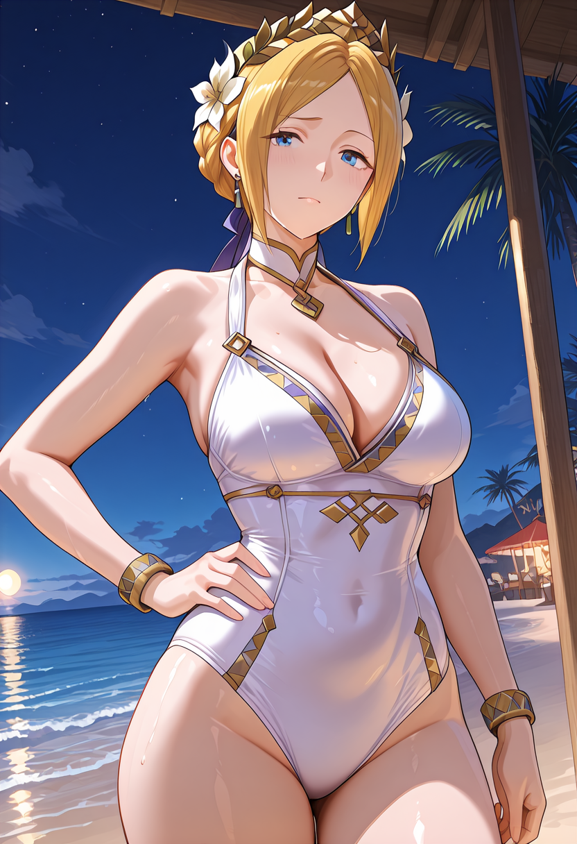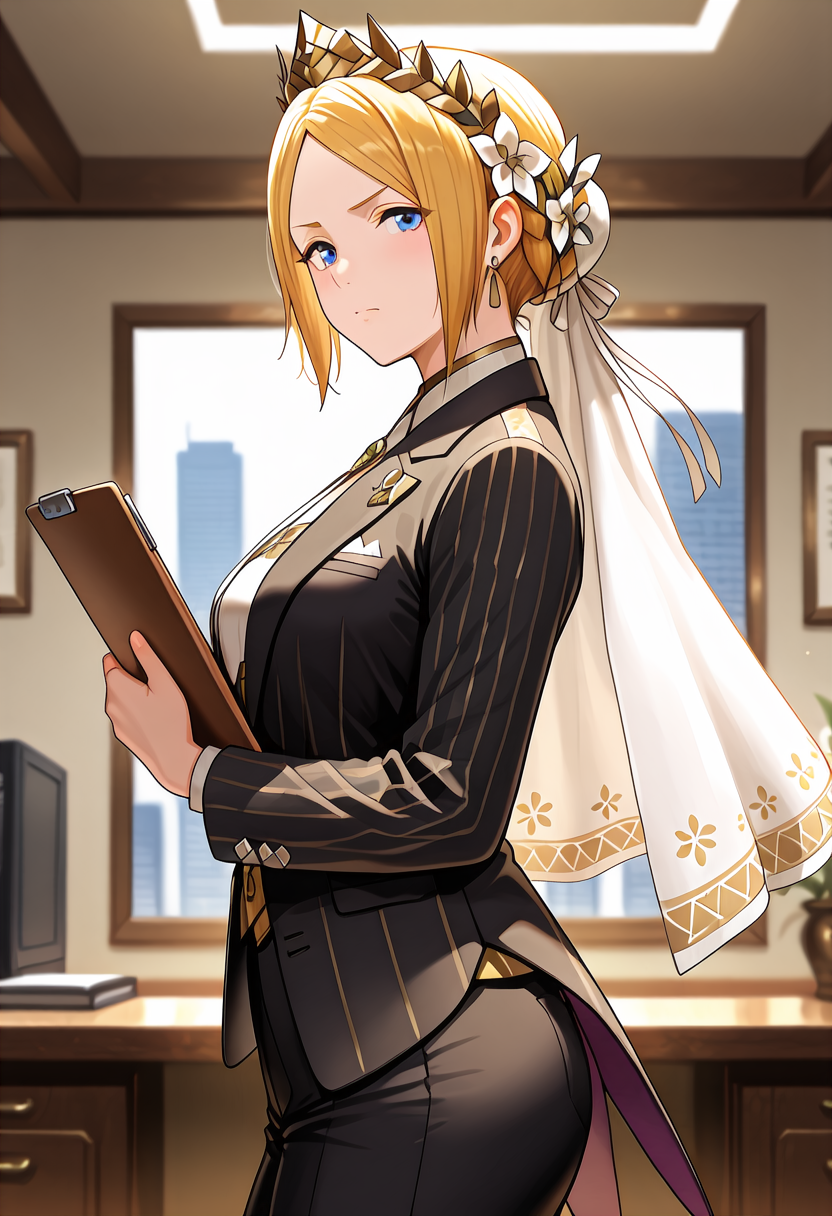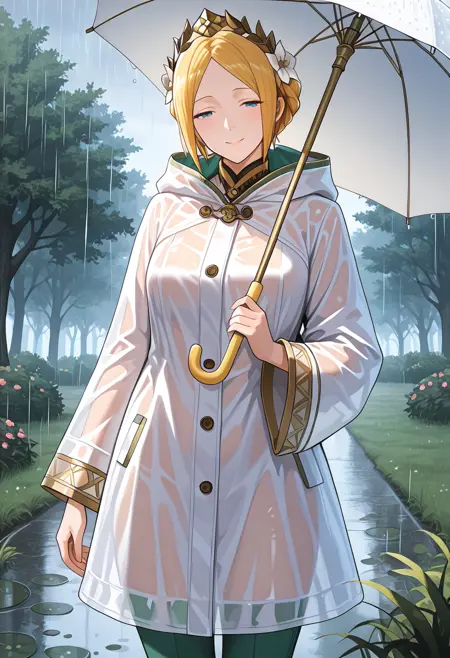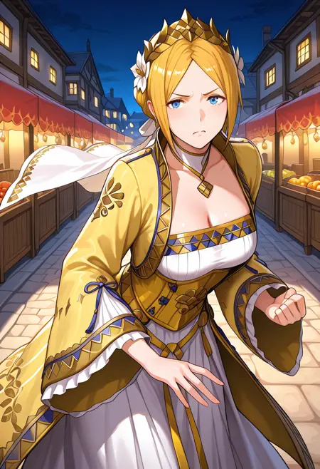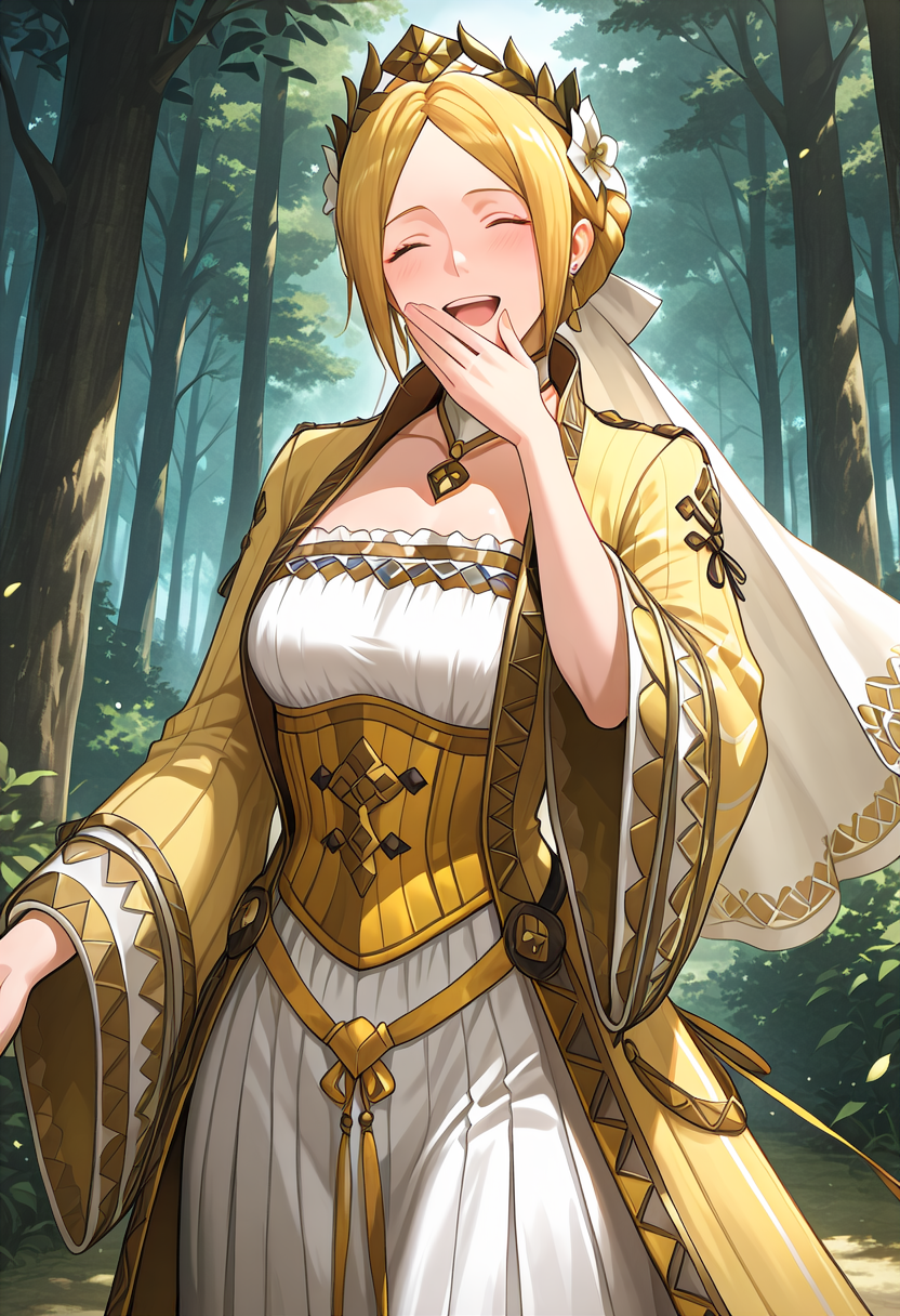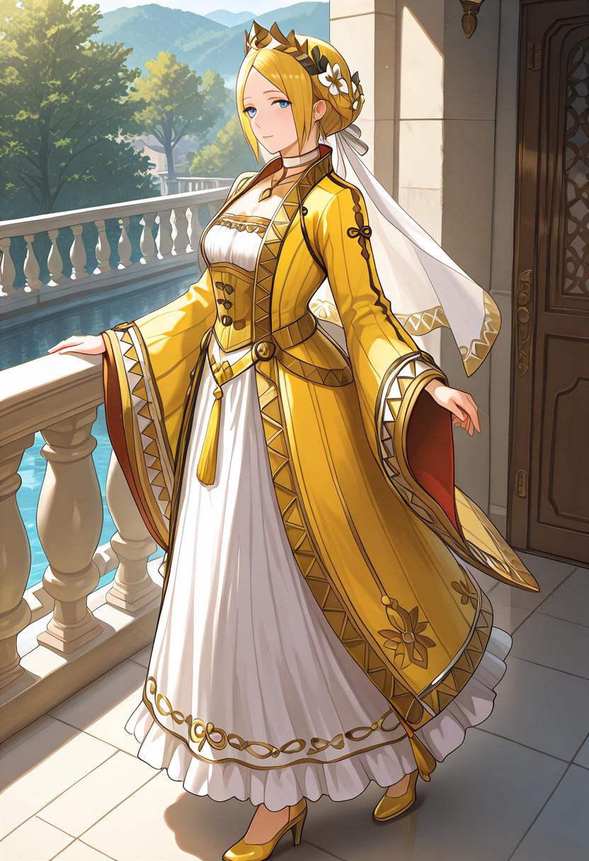 트리거 단어: YelenaFE, 금발, 중간 길이 머리, 중앙 분할 앞머리, 옆머리, 뒤로 묶은 머리, 반 올림머리, 파란 눈, 보석, 귀걸이, 머리 장식, 머리 꽃, 왕관, 흰 베일, 목걸이, 흰 치커, 흰 드레스, 긴 드레스, 노란 코셋, 긴 코트, 노란 코트, 긴 소매, 넓은 소매, 노란 신발, 하이힐