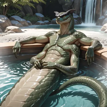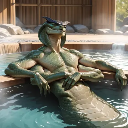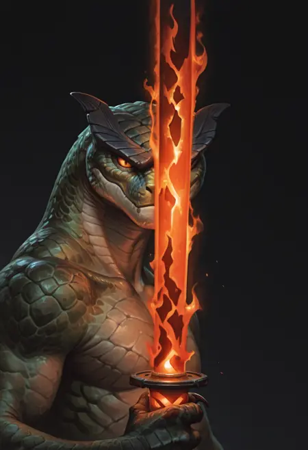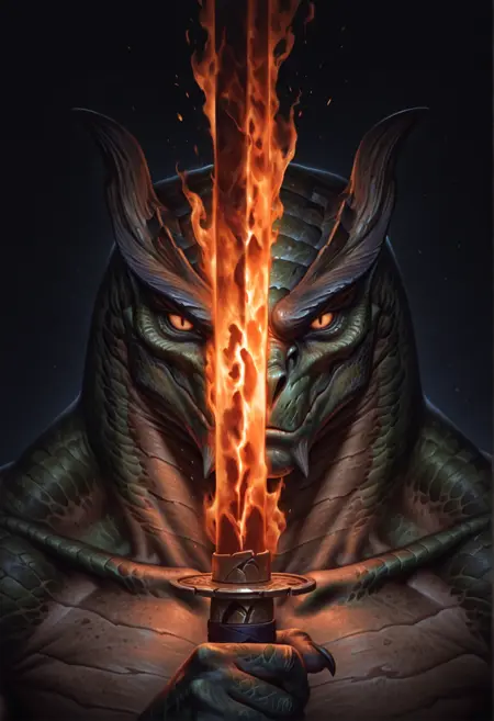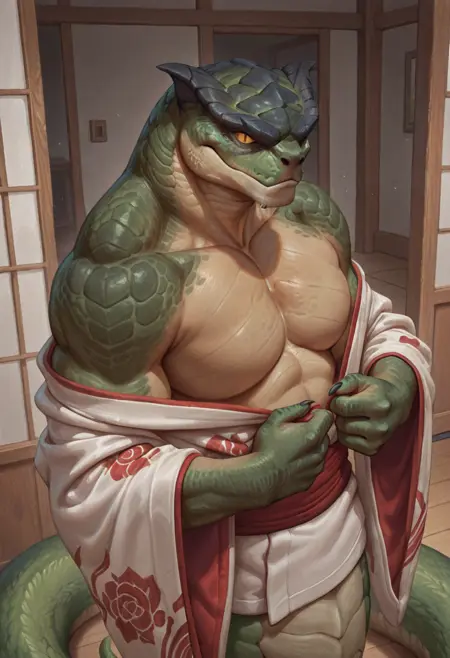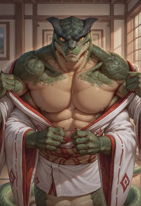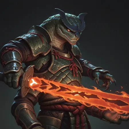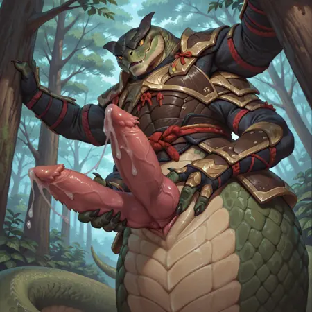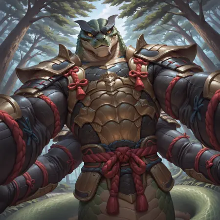 태그: 뱀, 라미아 소년, 네 개의 팔, 머리 뾰족한 무늬, 녹색 비늘, 추가 팔, 꼬리, 발톱, 사무라이 갑옷, 몬스터 소년