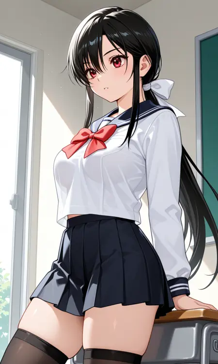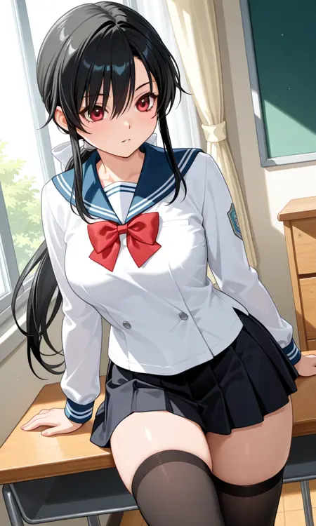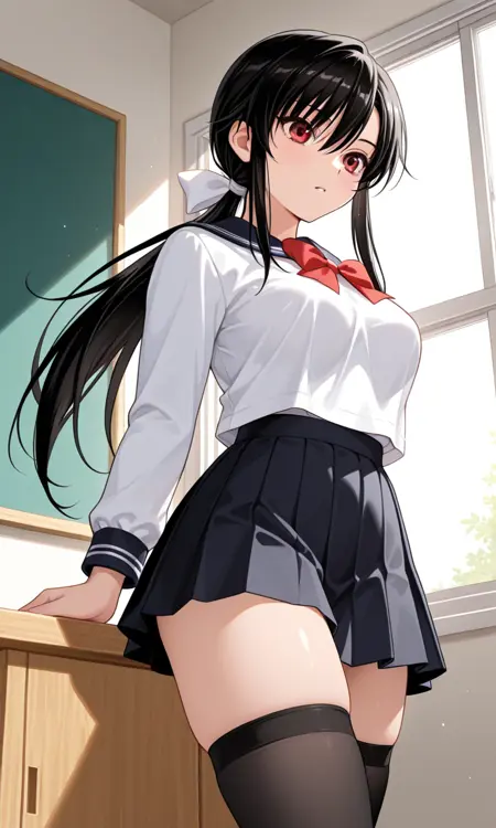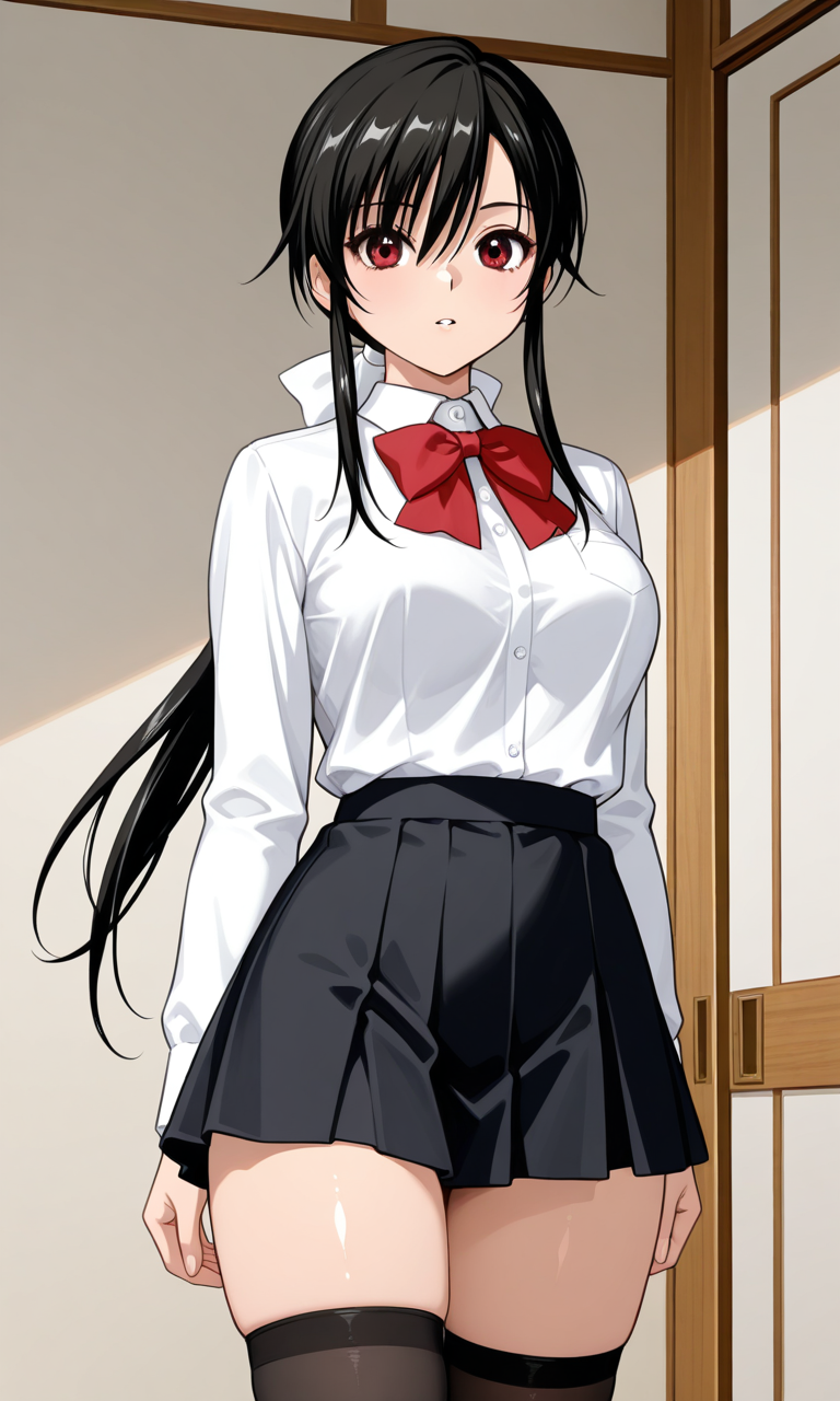 Midou Yukie (Shuukyuu Shoujo), long hair, low ponytail, long ponytail, ponytail tied with a white bow, locks in the front of the side of the hair, hair between eyes, black hair, red eyes, medium breasts, thighs, long sleeve shirt, white long sleeve shirt, school uniform, white school uniform, red bow tie, skirt, black skirt, short skirt, black short skirt, thigh high socks, black thigh high socks