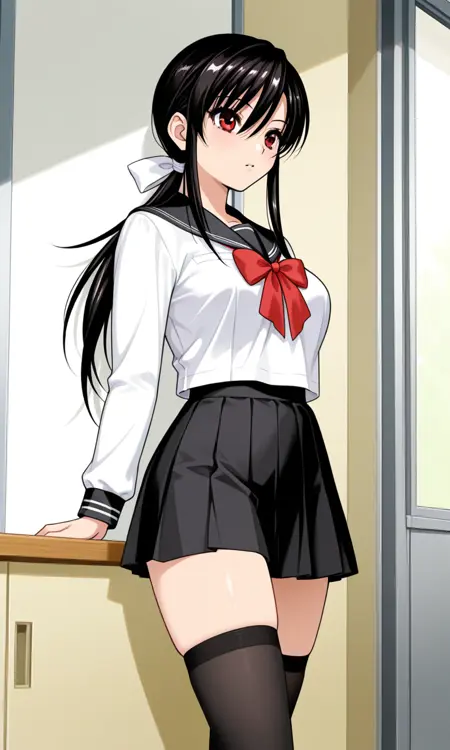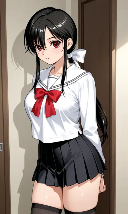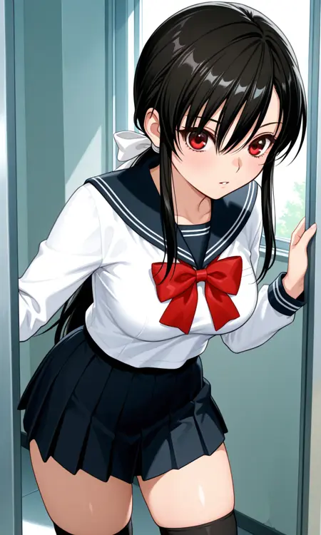 Midou Yukie (Shuukyuu Shoujo), long hair, low ponytail, long ponytail, ponytail tied with a white bow, locks in the front of the side of the hair, hair between eyes, black hair, red eyes, medium breasts, thighs