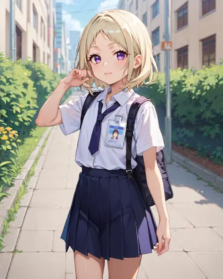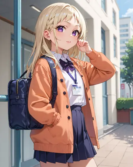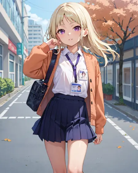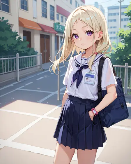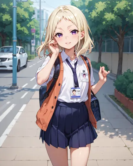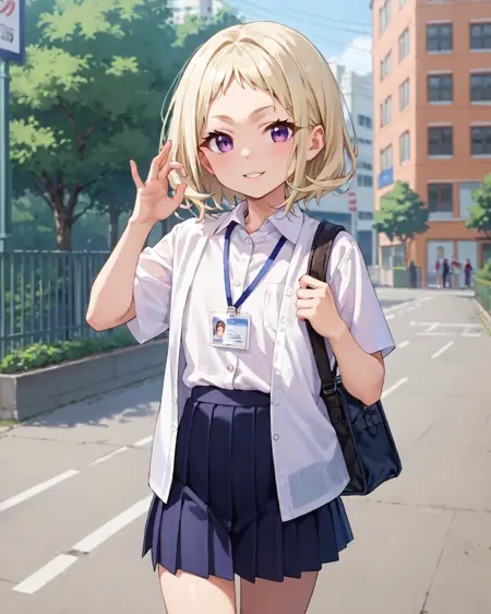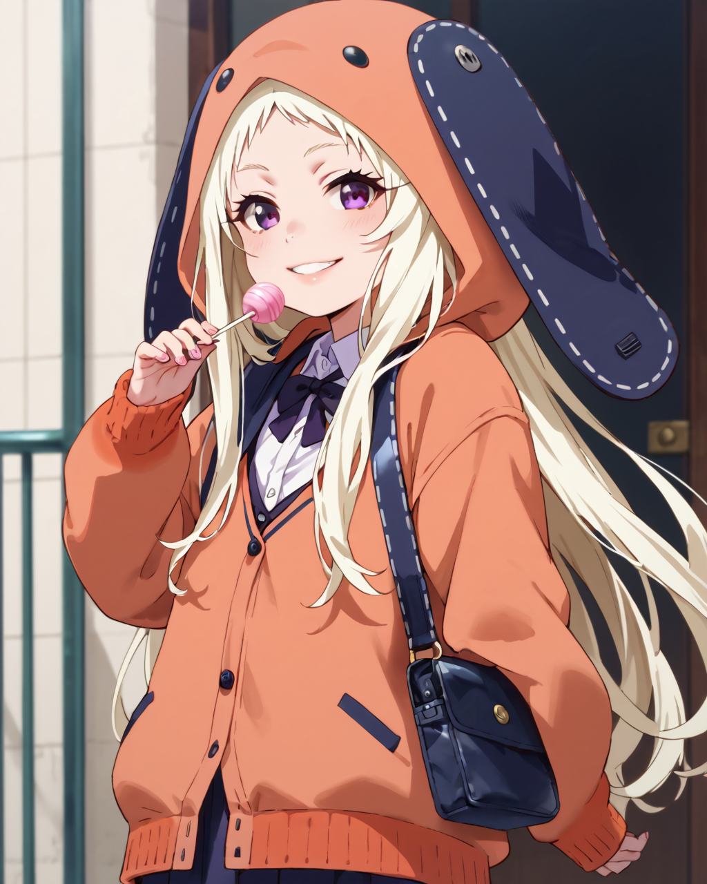Runa Yomozuki, runa, light blonde hair, purple eyes, flat-chested, 1girl, solo, candy, long hair, lollipop, food, blonde hair, skirt, hood, school uniform, animal hood, smile, white hair, jacket