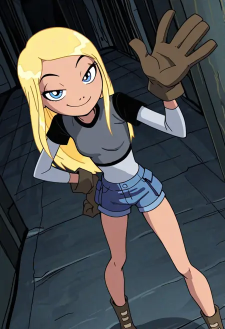 black long-sleeved shirt with circular yellow symbol, bright yellow shorts ,brown gloves, oversized gloves, utility belt, tight yellow shorts, mid-thigh length shorts, large boots, yellow boots, rounded toes,