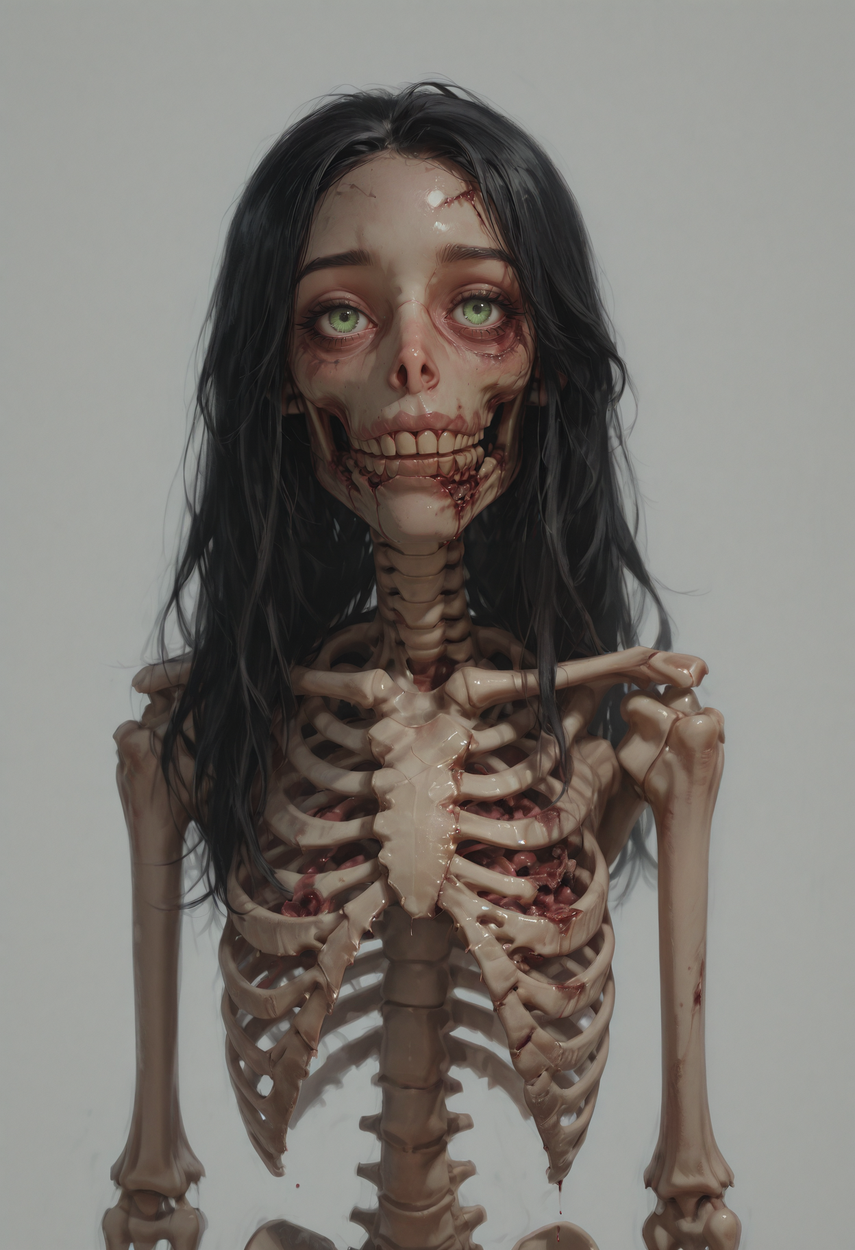f3o, 1girl, green eyes, black hair, solo, blood, looking at viewer, ribs, short hair, blurry, bone, blurry background, skeleton, horror (theme), spine, upper body