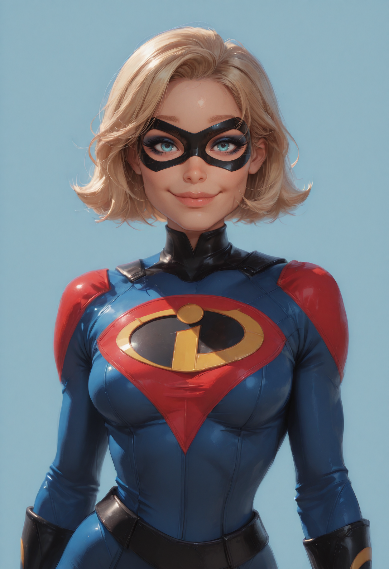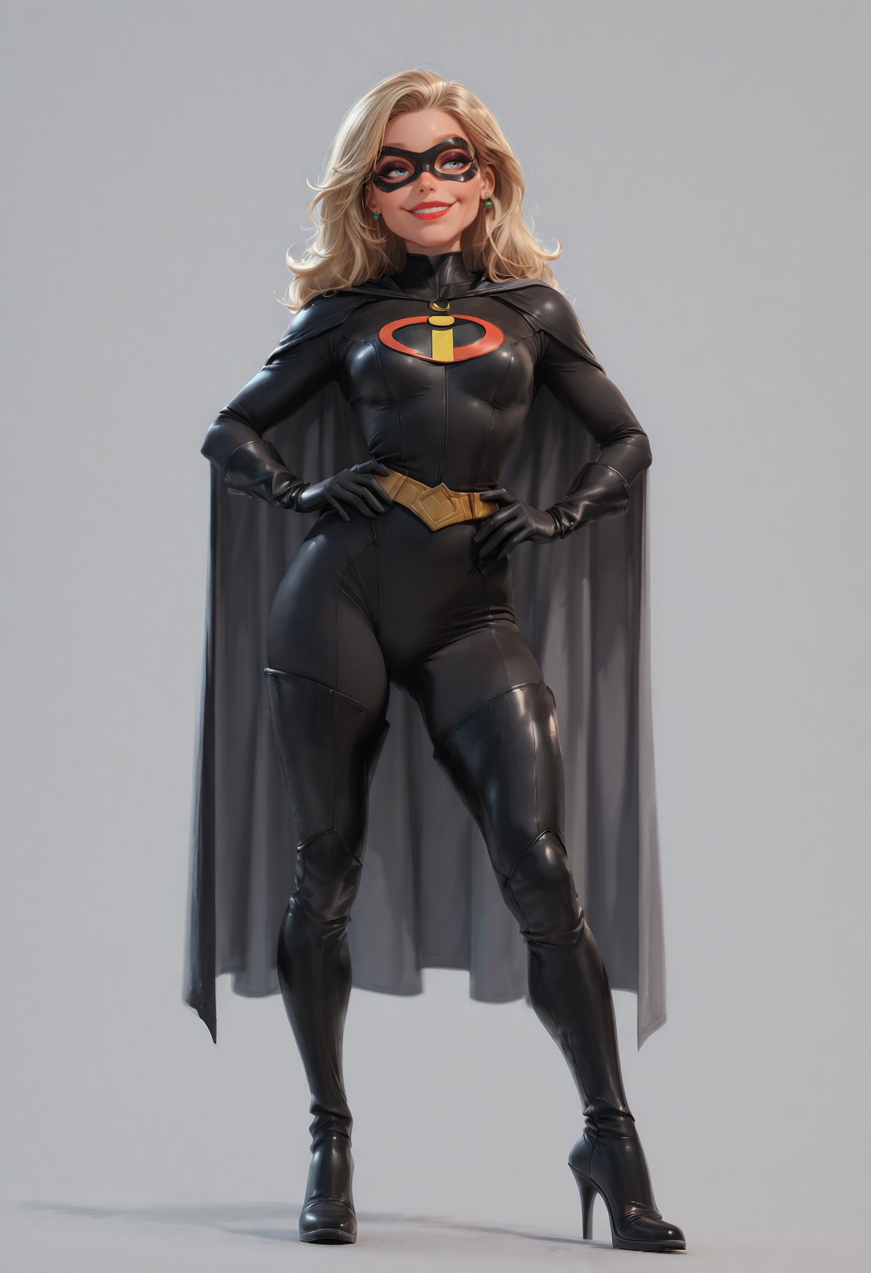 f4o, 1girl, solo, earrings, jewelry, hands on hips, blue eyes, gloves, mask, domino mask, smile, blonde hair, breasts, lipstick, black gloves, superhero, grey background, makeup, looking at viewer, bodysuit, simple background, small breasts, short hair, cowboy shot, belt, turtleneck, red lips, lips
