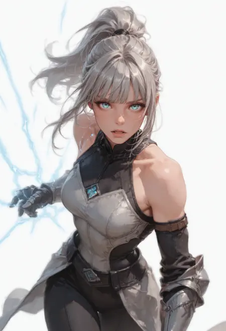 f1o, 1girl, solo, blue eyes, open mouth, gauntlets, looking at viewer, white background, ponytail, bare shoulders, simple background, gloves, pants, black pants, breasts, long hair, bangs, electricity, grey hair
