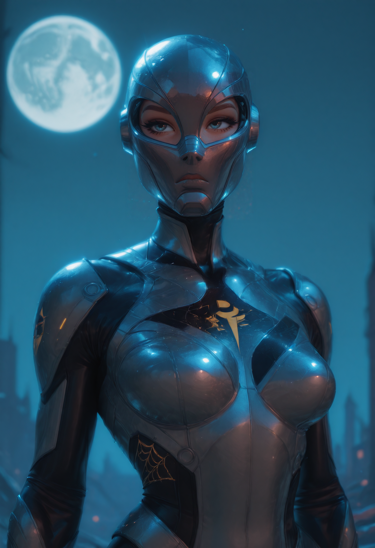 f5o, futuristic armor, glowing neon accents, full-body suit, sci-fi, metallic texture, visor helmet, high detail, 3d render, 1girl, solo, bodysuit, helmet, breasts, medium breasts, upper body, blue background, skin tight