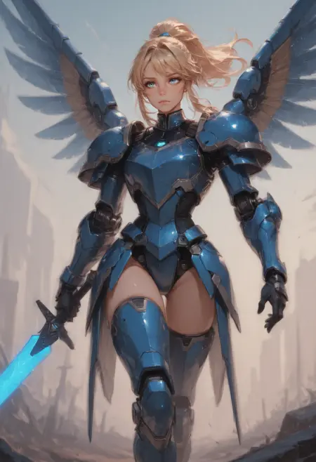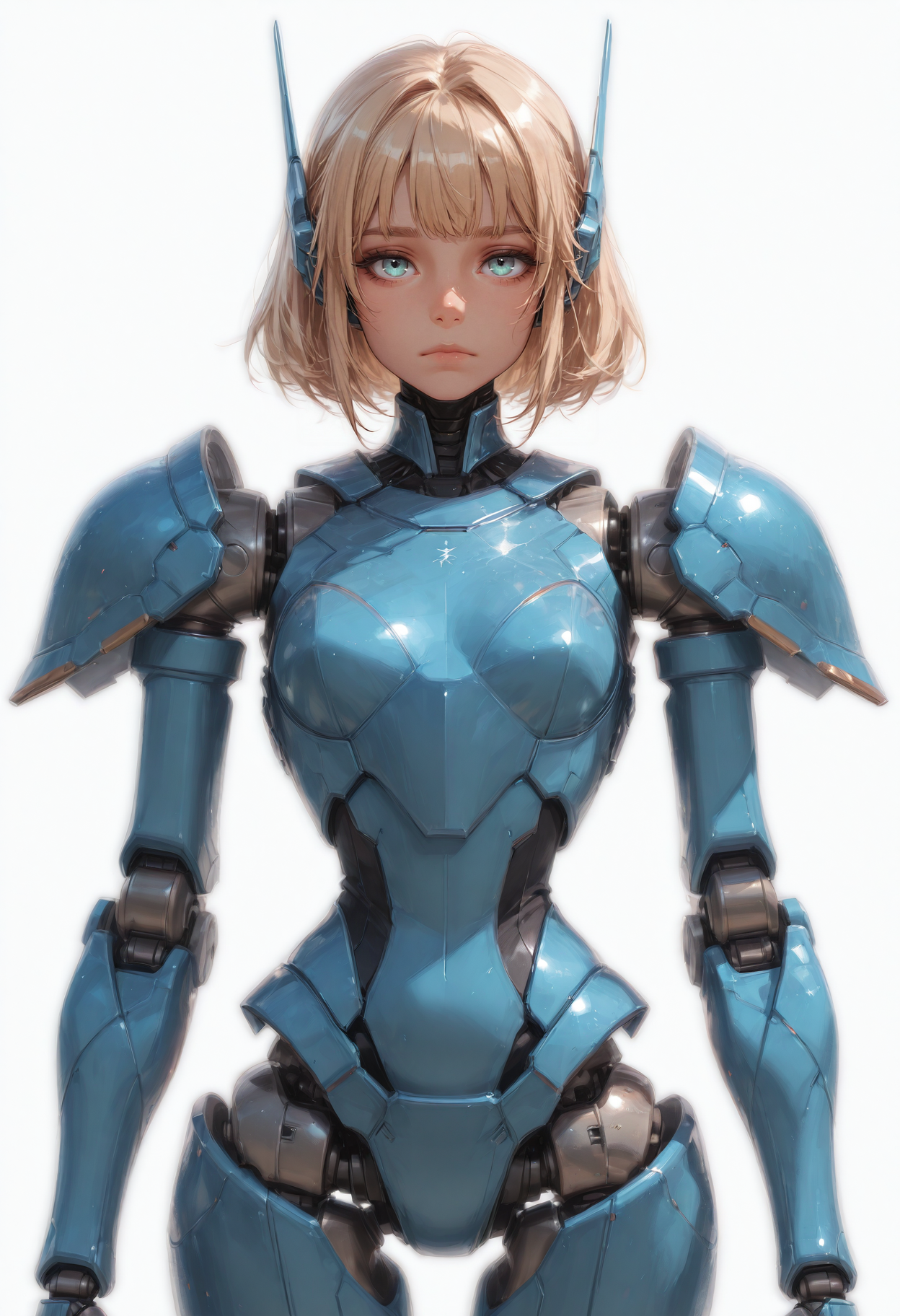 f2o, azurea, cobalt_armor, glowing_cyan_lines, lineless_anime, 1girl, solo, blonde hair, white background, mecha musume, looking at viewer, blue eyes, simple background, armor, short hair, thigh gap, closed mouth, bangs, joints, headgear, cowboy shot, thighs, expressionless, android
