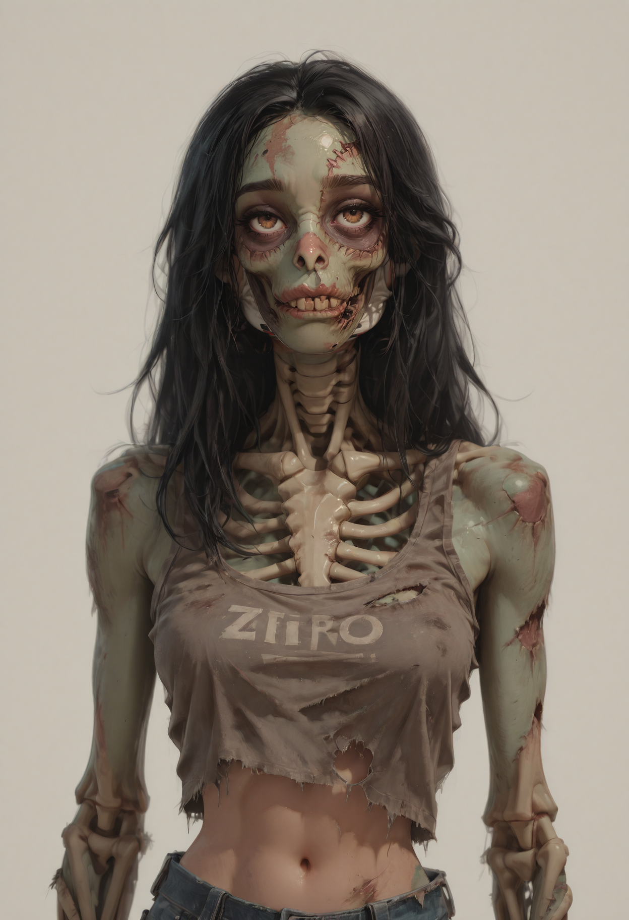 f3o, 1girl, solo, brown eyes, black hair, navel, torn clothes, blood, injury, tank top, zombie, midriff, breasts, short hair, looking at viewer, guro, realistic, simple background, bone, skeleton, medium breasts