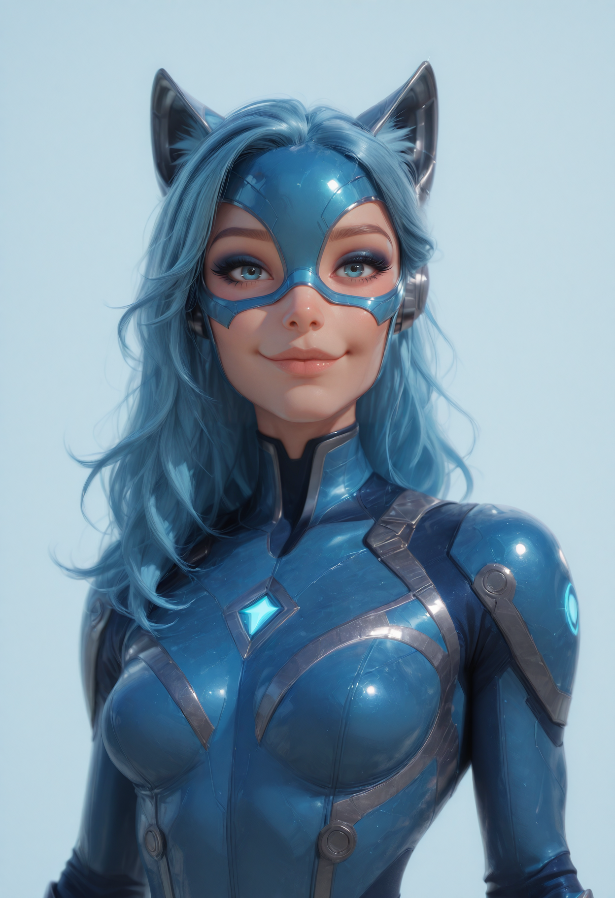 f5o, futuristic armor, glowing neon accents, full-body suit, sci-fi, metallic texture, visor helmet, high detail, 3d render, 1girl, solo, blue eyes, breasts, bodysuit, blue hair, animal ears, looking at viewer, smile, superhero, mask, long hair, upper body, lips, simple background, small breasts, cat ears, makeup, medium breasts, blue background, skin tight, blue bodysuit