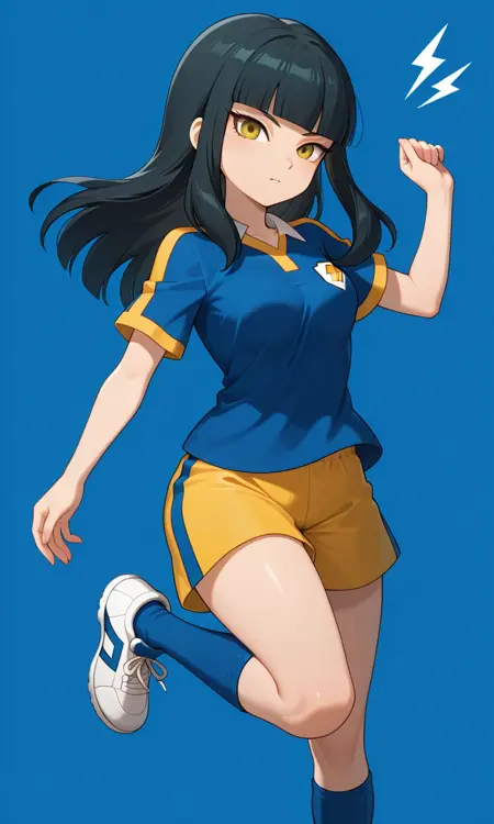 Dhanna (Inazuma Eleven), black hair, long hair, yellow eyes, blunt bangs, hair between eyes, medium breasts, thighs, raimon soccer uniform, shirt, blue shirt, short sleeves, lightning bolt symbol, shorts, yellow shorts, socks, blue socks, shoes, sneakers