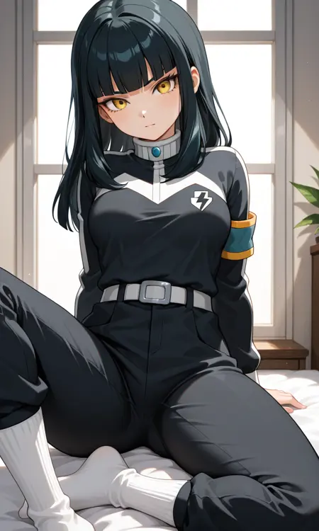 Dhanna (Inazuma Eleven), black hair, long hair, yellow eyes, blunt bangs, hair between eyes, medium breasts, thighs, black shirt, belt, black pants, protocol omega, long sleeves