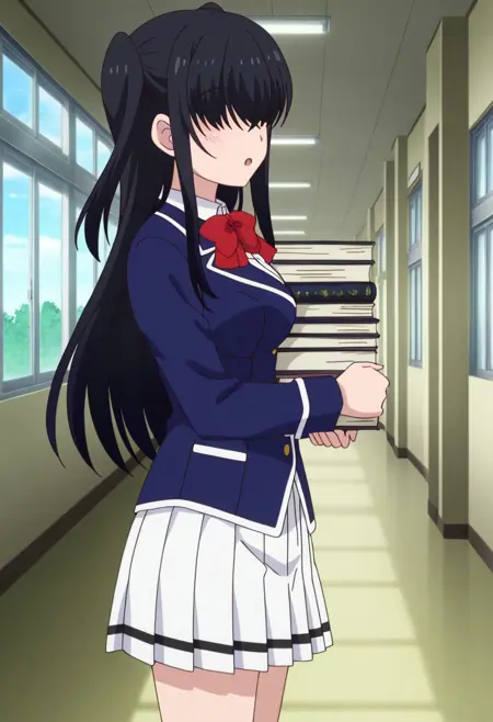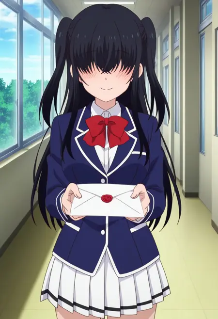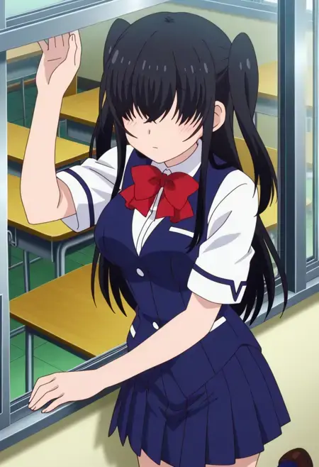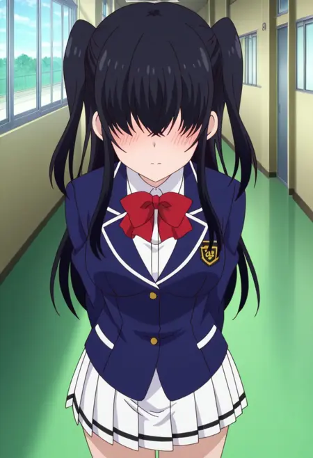 SayoUniform, 1girl, solo, black hair, long hair, twintails, hair over eyes, medium breasts, fair skin, school uniform, white pleated skirt, red bowtie, blue blazer, long sleeves, white shirt, blue socks, brown loafers,