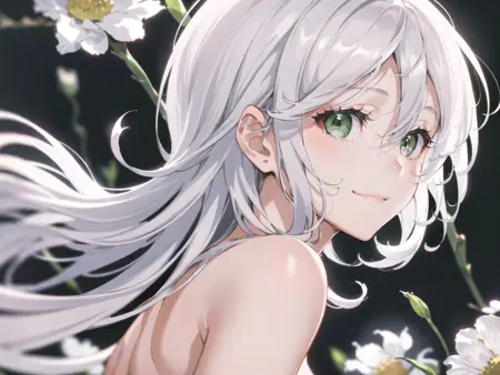 Steps: 20, Sampler: DPM++ SDE Karras, CFG scale: 5.5, Seed: 872925101, Size: 512x768, Model hash: 79846849a1, Clip skip: 2, ENSD: 31337vvi\(artstyle\), 1girl, solo, flower, long hair, green eyes, looking at viewer, black background, smile, white flower, hair between eyes, floating hair, closed mouth, portrait, bangs, bare shoulders, grey hair, lily (flower), simple background, eyelashes, white hair, yellow eyes, eyes visible through hair, upper body,lora:Vivid\_Impactful\_Style\_locon\_v4h:0.7