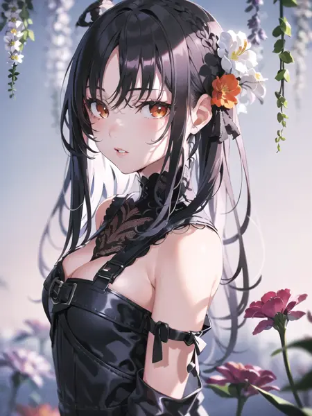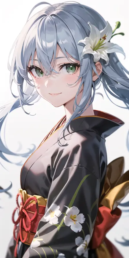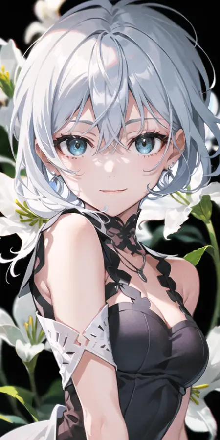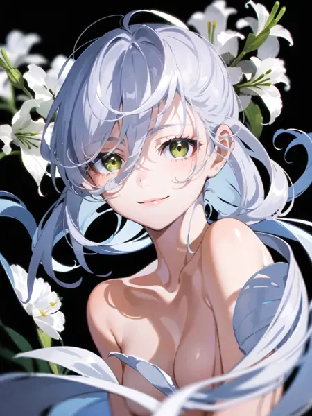 Steps: 20, Sampler: DPM++ SDE Karras, CFG scale: 5.5, Seed: 872925101, Size: 512x768, Model hash: 79846849a1, Clip skip: 2, ENSD: 31337vvi\(artstyle\), 1girl, solo, flower, long hair, green eyes, looking at viewer, black background, smile, white flower, hair between eyes, floating hair, closed mouth, portrait, bangs, bare shoulders, grey hair, lily (flower), simple background, eyelashes, white hair, yellow eyes, eyes visible through hair, upper body,lora:Vivid\_Impactful\_Style\_locon\_v4h:0.7