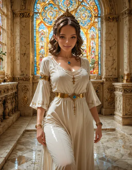 Trigger words: 1girl, long brown hair, curly hair, erect chest, white tunic, ultra detailed, intricate details, realistic