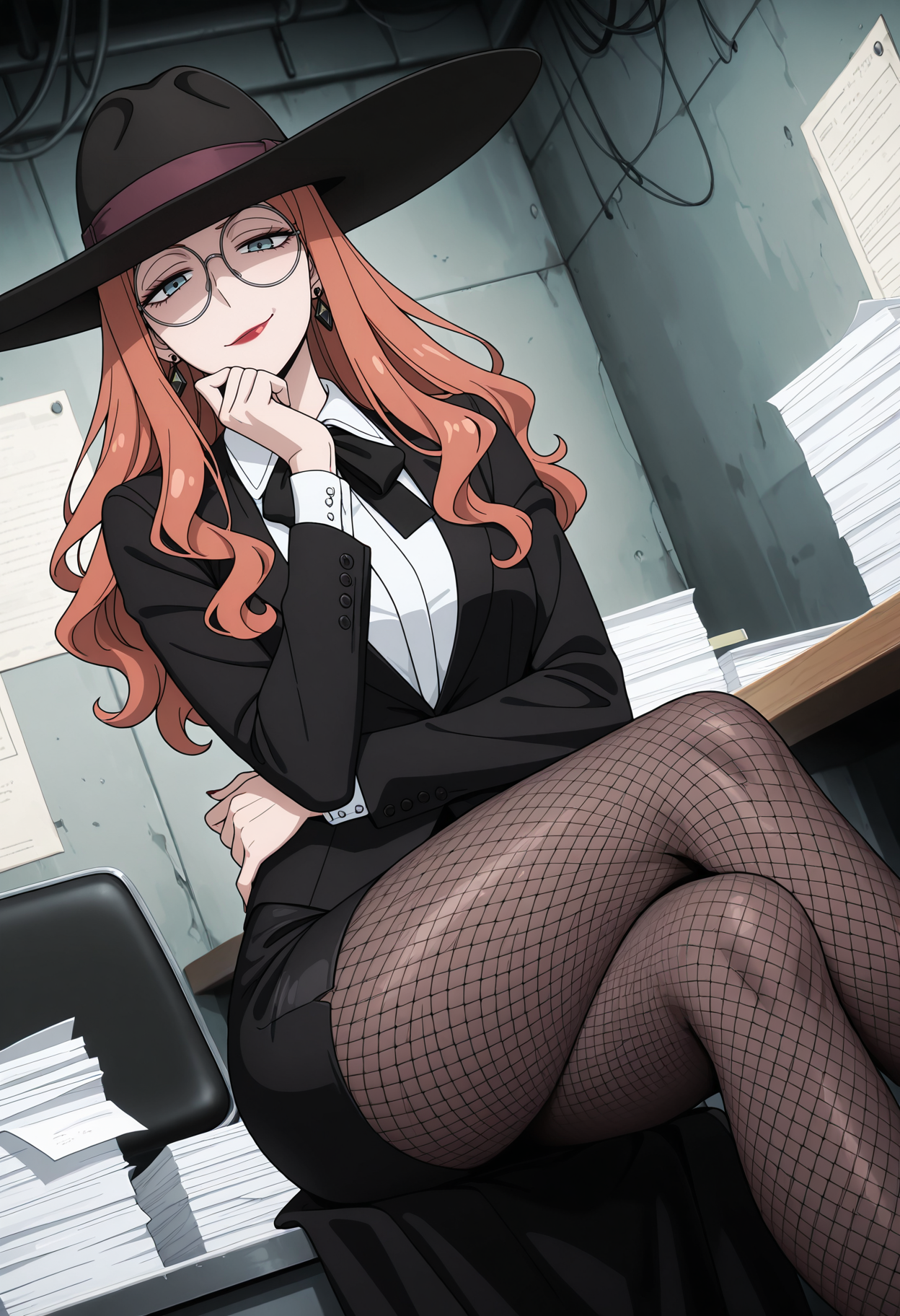 KJOsylvia, orange hair, blue eyes, long hair, sidelocks, round eyewear, red lips, hat,