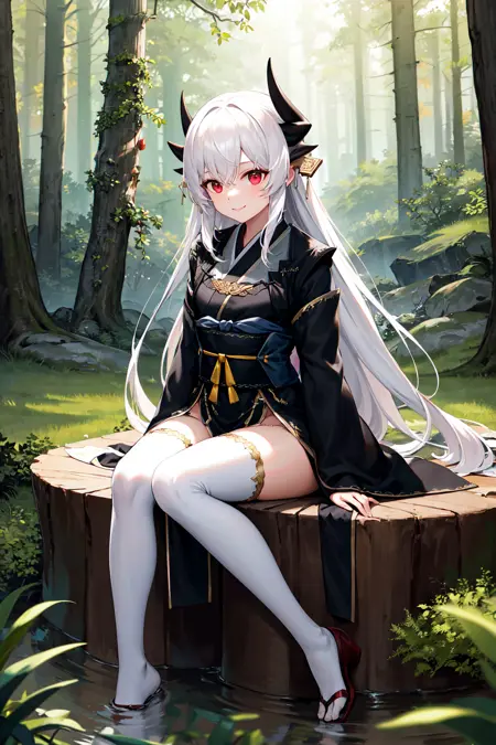 outfit3cckiyo, long hair, white hair, black horns, hair ornament, red eyes, medium breast, multicolored kimono, black kimono, long sleeves, wide sleeves, sash, obi, pelvic curtain, white thighhighs