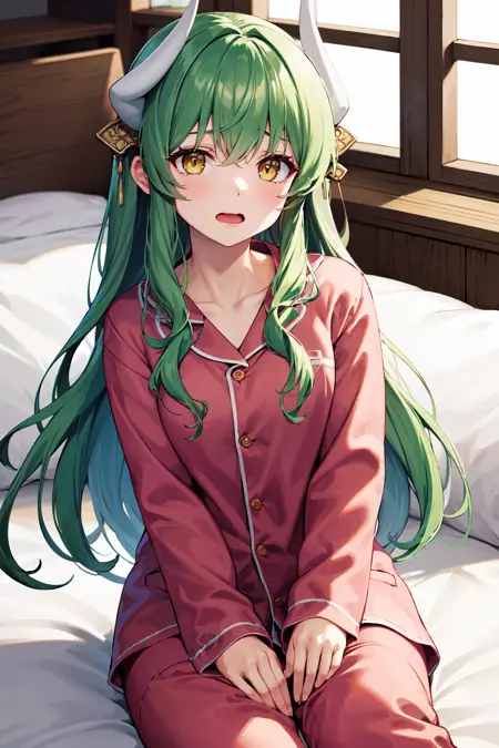 outfit1aakiyo, long hair, aqua hair, white horns, hair ornament, yellow eyes, medium breasts, green kimono, long sleeves, wide sleeves, sash, obi, pelvic curtain, white thighhighs