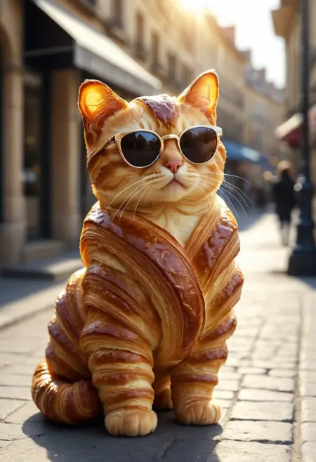 "masterpiece, realistic, made of croissants, cat, sunglasses, standing, street background, soft sunlight, high detail"