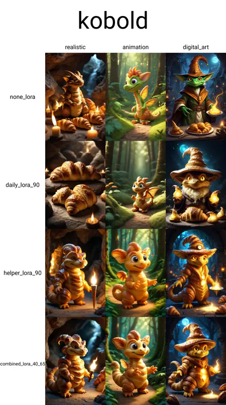 "masterpiece, digital art, made of croissants, kobold mage, wizard hat, glowing eyes, fantasy art, high detail"