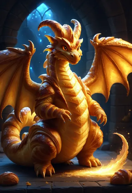 "masterpiece, made of croissants, fantasy dragon, wings, wizard hat, glowing scales, digital painting, digital art, high detail"