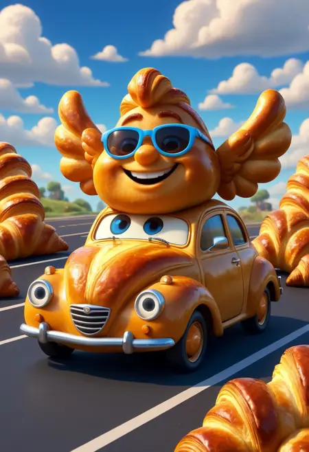 "masterpiece, vibrant, animation, made of croissants, car, wings, smiling, sunglasses, pixar style, cloud road"