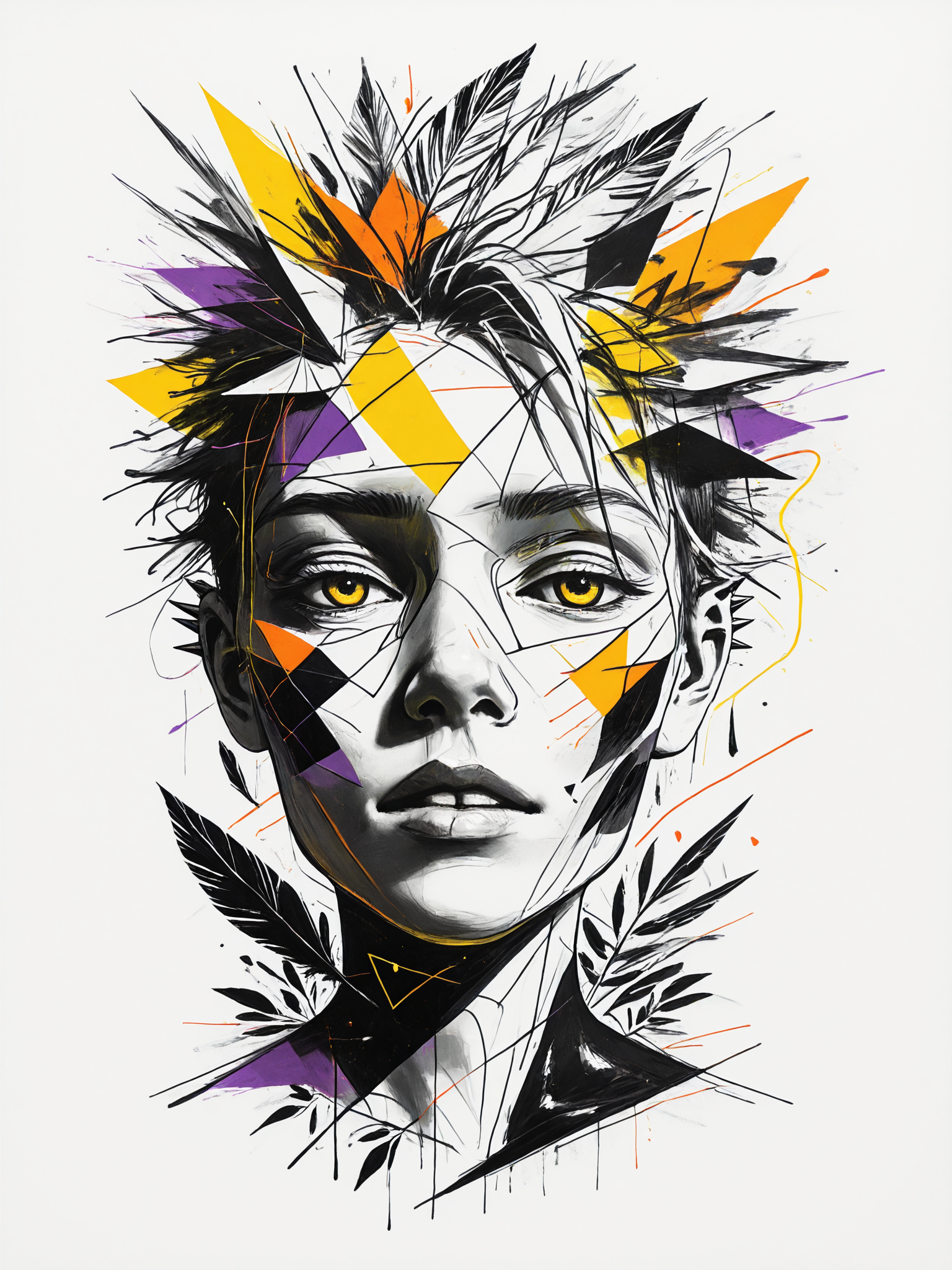 GILD3D, abstract portrait style, bold graphic lines, high contrast, vibrant color palette (yellow, orange, purple, black), impasto texture, paint splatters, drips, expressive brushstrokes, fragmented composition, dynamic energy, street art influence, pop surrealism, emotional intensity, abstract elements (feathers, leaves, geometric shapes), white background, raw and edgy aesthetic, textured surface, non-realistic, stylized, artistic expression, dramatic lighting, chaotic yet balanced, contemporary art