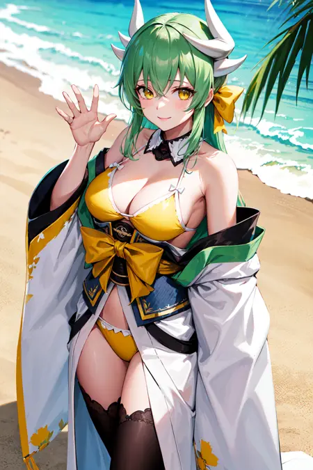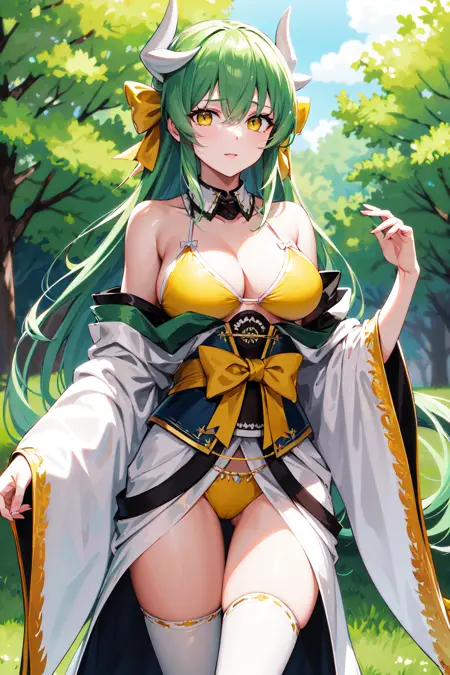 outfit1aakiyo, 긴 머리, 청록색 머리, 흰색 뿔, 낮은 트윈테일, 머리 리본, 노란 리본, 노란 눈, 중간 크기의 가슴, 분리형 칼라, 가슴 노출, 노란 비키니, 어깨 드러냄, 흰색 키모노, 띠, 오비, 흰색 허벅지 긴 양말