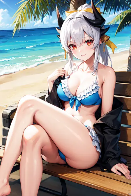 outfit3cckiyo, 긴 머리, 흰색 머리, 검은색 뿔, 언더테일, 머리 리본, 노란 리본, 머리 장식, 붉은 눈, 중간 크기의 가슴, 가슴 노출, 프릴이 있는 비키니, 파란색 비키니, 어깨 드러냄, 검은색 하오리, 열린 옷