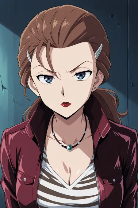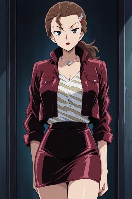 brown hair, long hair,ponytail,hair clip, dark blue eyes,red lips,necklace,red jacket, white striped shirt, red skirt,