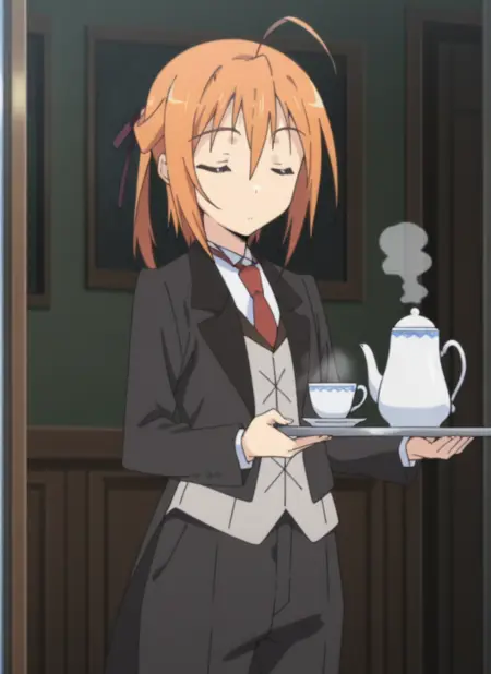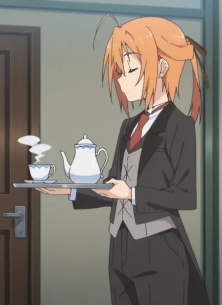 butler uniform, black tailcoat, red tie, white shirt, black pants, black dress shoes