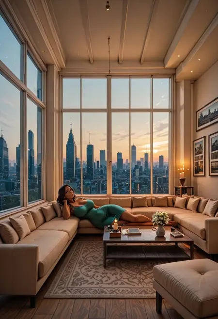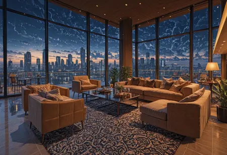他の助けとなるトリガー: high wall, wall window, multiple windows, scenery, low table, table, couch, armchair, floor lamp,