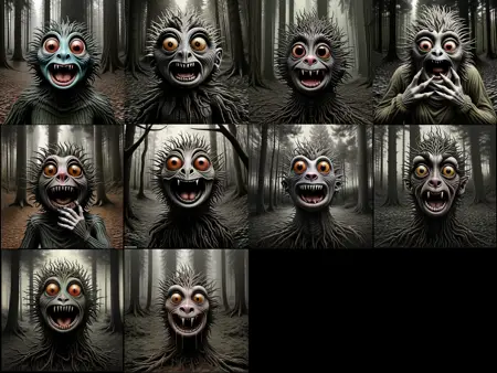 在惊讶生物的面部上训练,使用“surprised”或“creatures”或两者同时使用来触发LoRA,强度范围为0.2至0.8