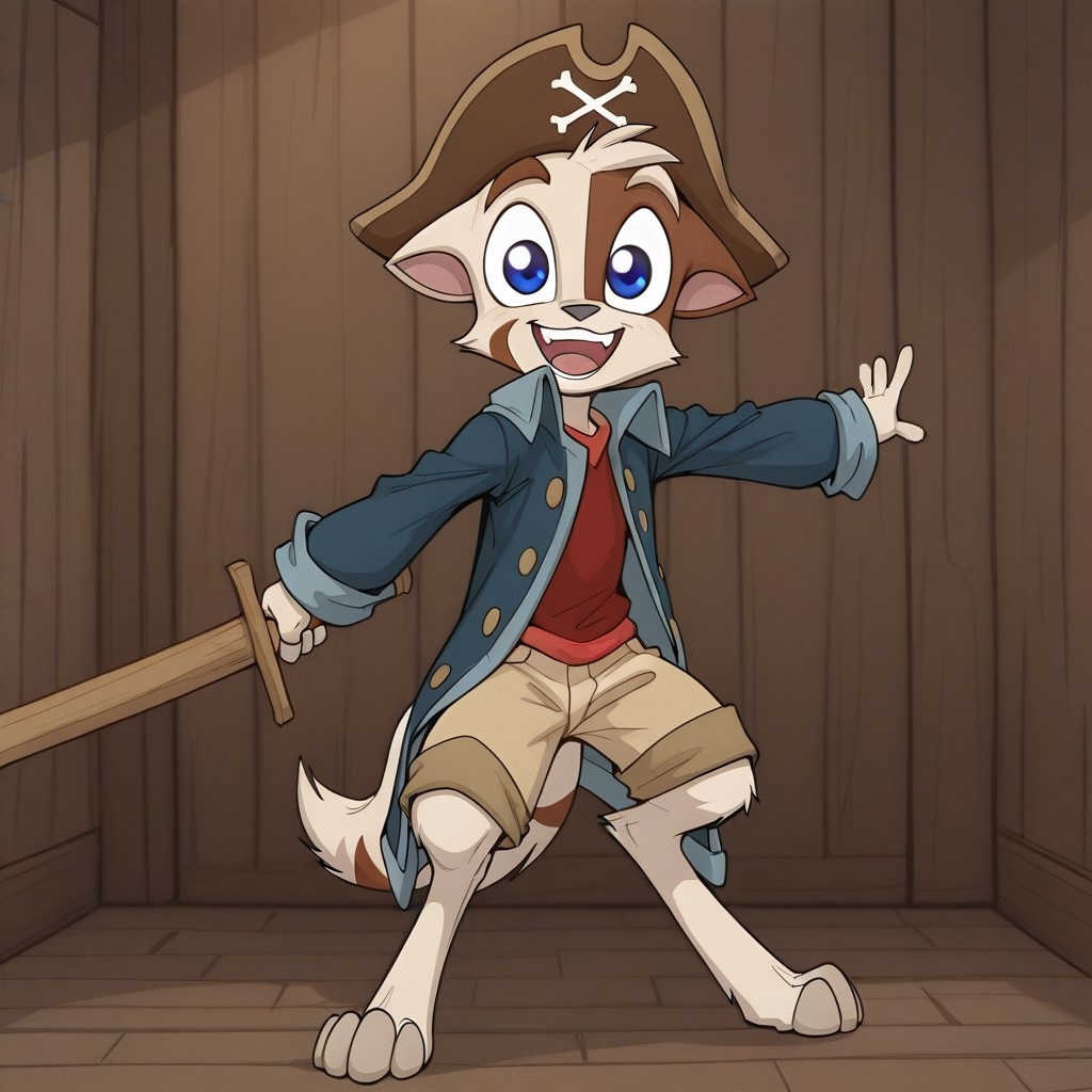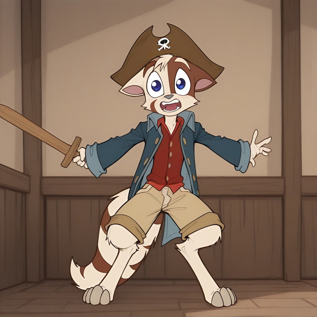 pirate costume, pirate hat, wooden sword, blue jacket, red shirt, weapon, sword, holding weapon, holding sword,