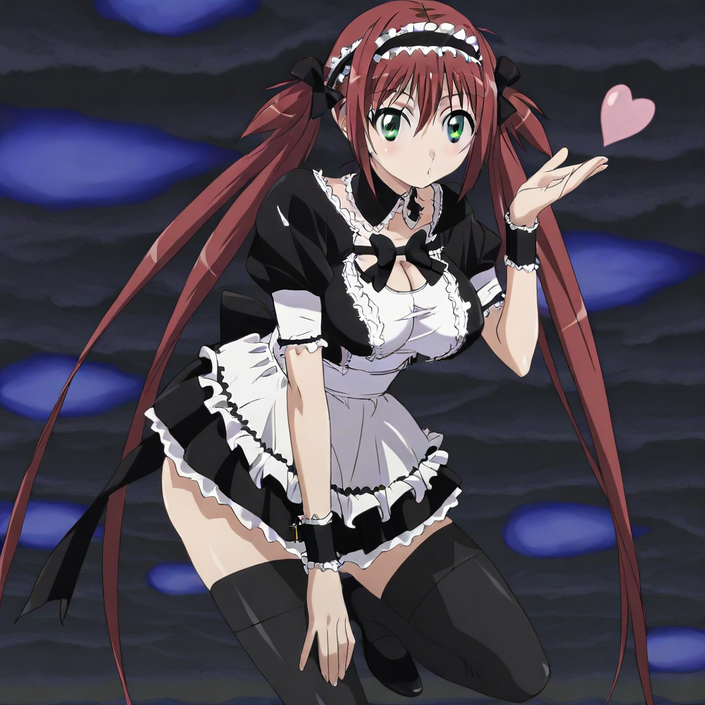 airi \(queen's blade\), red hair, long hair, twintails, bangs, sidelocks, aqua eyes, maid headdress, hairbows, maid outfit, maid, bow, collar, skirt, wrist cuffs, thighhighs, heels, cleavage, large breasts, 1girl, solo