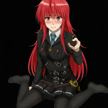 xam yatorishino \(tenkyou\), red hair, long hair, bangs, sidelocks, red eyes, military uniform, skirt, belts, straps, pantyhose, heels, large breasts, 1girl, solo
