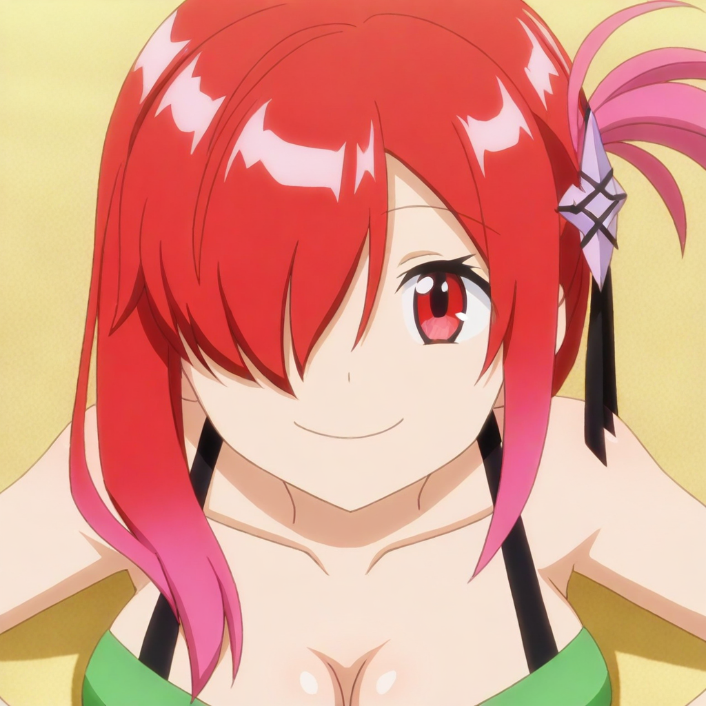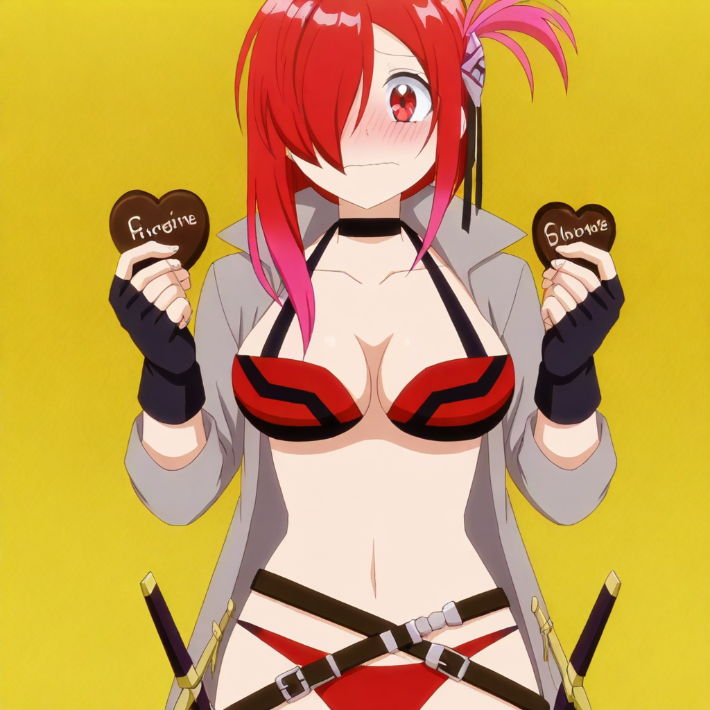 | トレーニングワード | katie \(tsuihousha\), multicolored hair, red hair, pink hair, long hair, asymmetrical hair, hair tied up, hair over one eye, red eyes, hair ornament, grey coat, open clothes, red and black bikini, halterneck bikini, choker, straps, belts, fingerless gloves, thighhighs, heels, cleavage, large breasts, 1girl, soloコピーしました! |