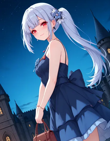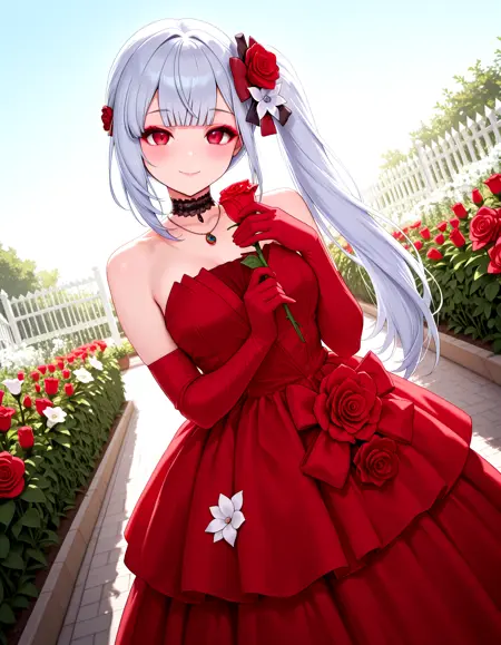 Freesia_Stella, 长发, 红眼, 侧马尾, 灰发, 发饰, 头发花朵, 白花, 胸部, 侧发, 齐刘海