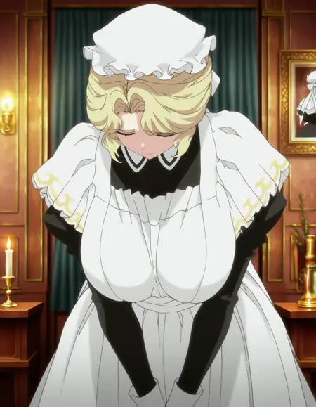 mai_mariav,,anime_coloring,mature_female,large_breasts,maid,apron,blonde_hair,blue_eyes,mob_cap,black_dress,long_sleeves,maid_apron,white_apron,short_hair,black_legwear