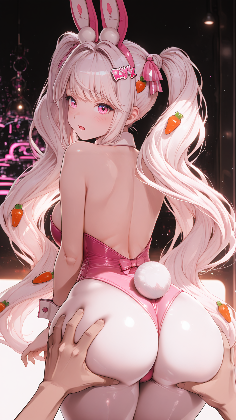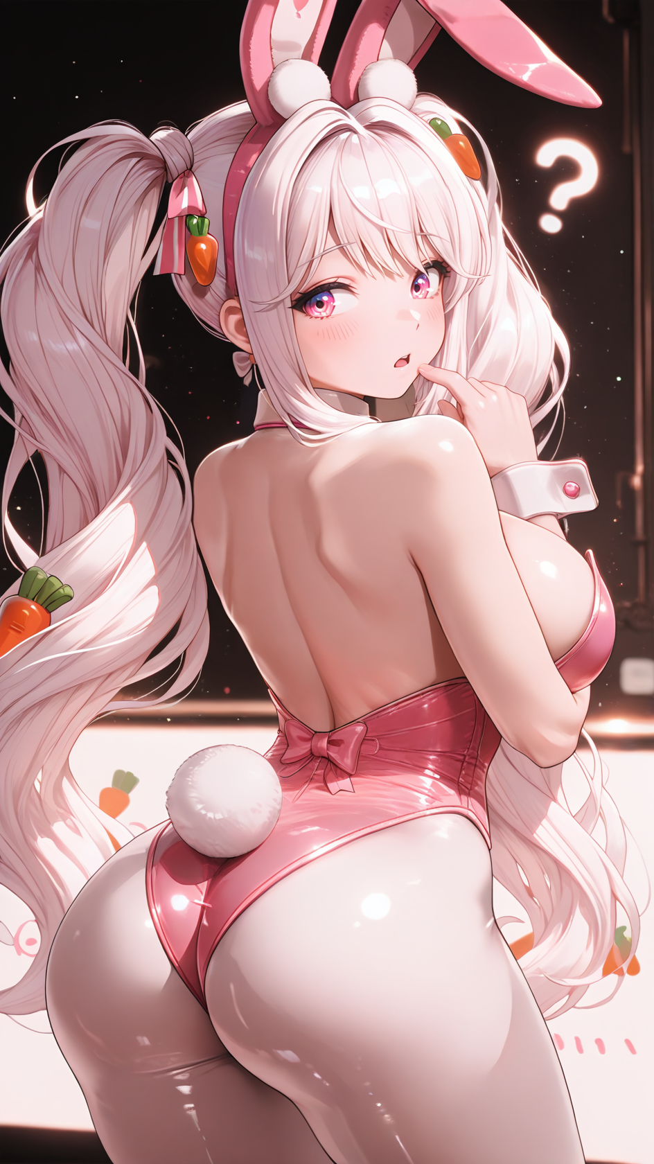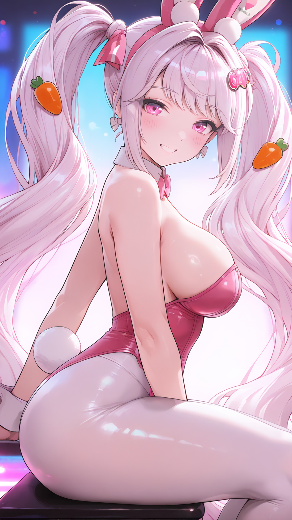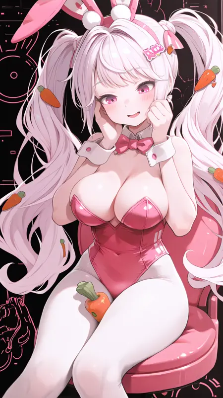 예시 프롬프트: 긴 머리, 분홍색 눈, 앞머리, 큰 가슴, 머리 장식, 리본, 더블 테일, 매우 긴 머리, 흰색 머리, 팬티스타킹, 토끼 귀, 레오타드, 손목 커프스, 부츠, 스니커즈,