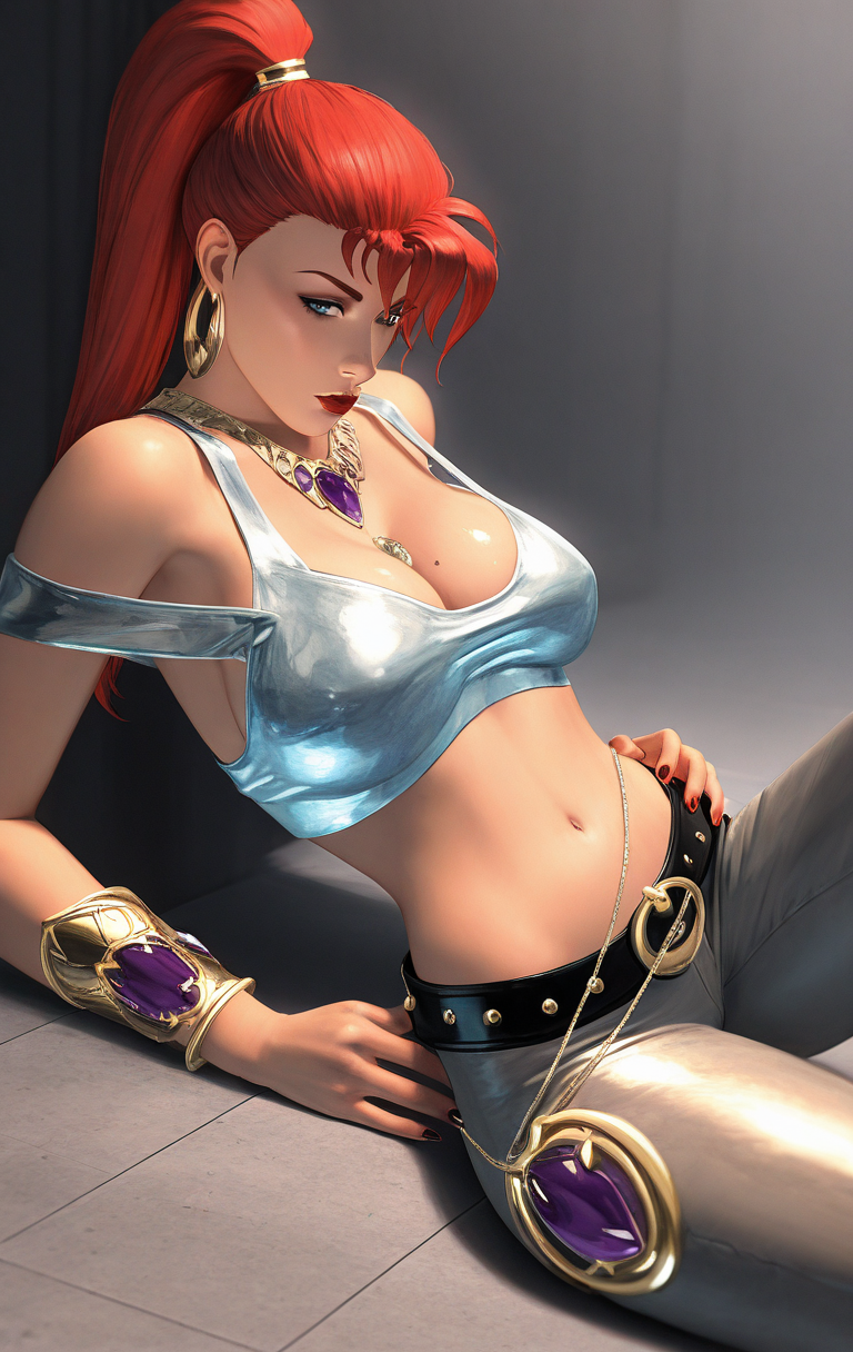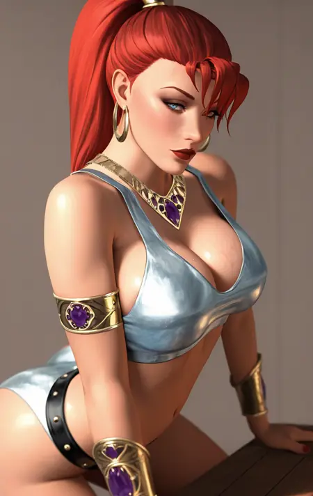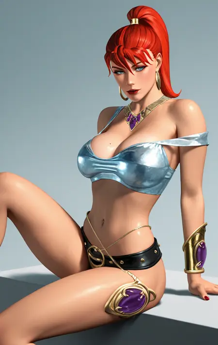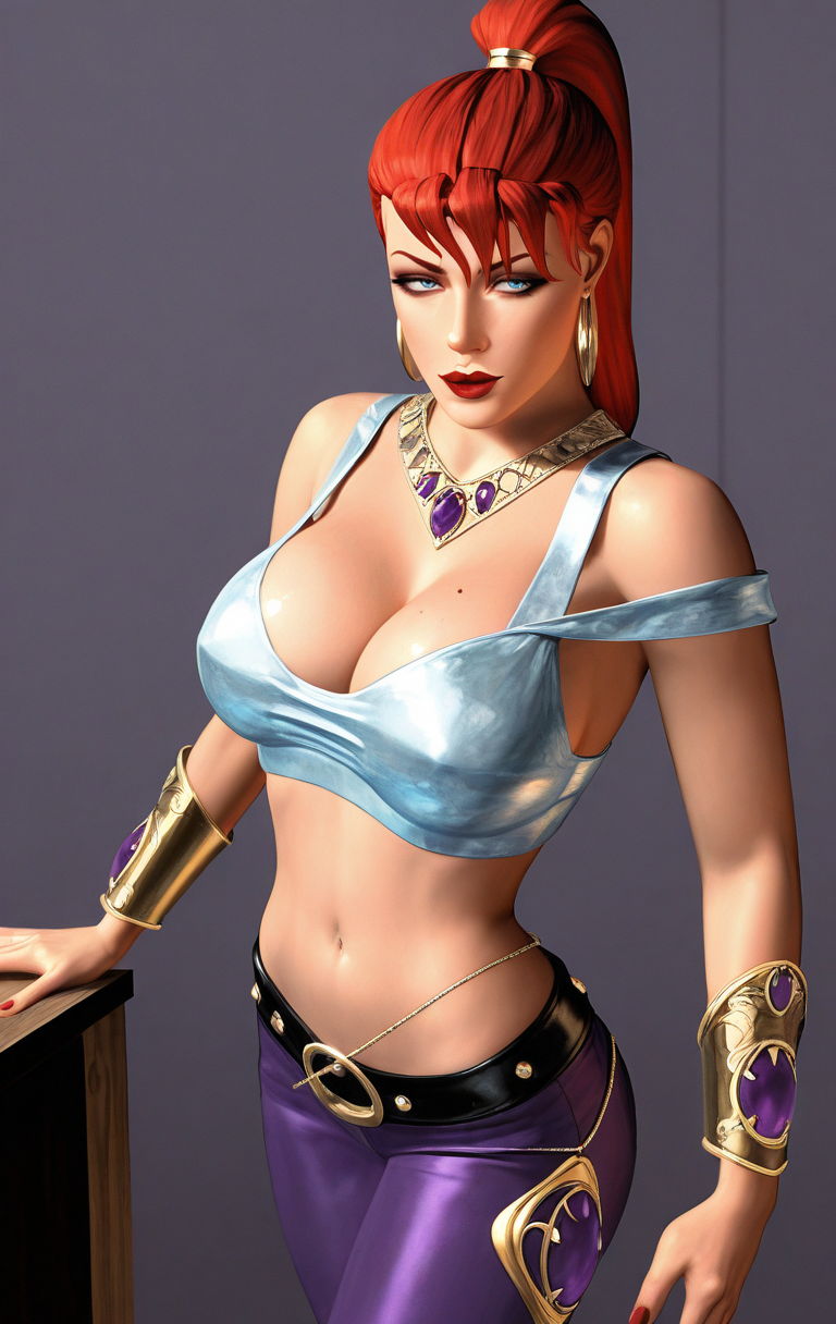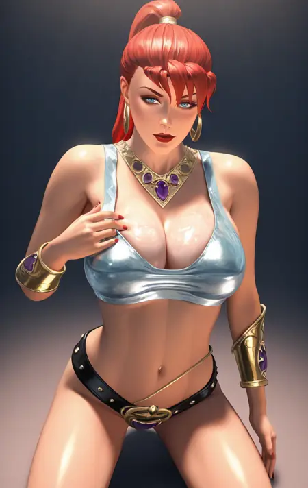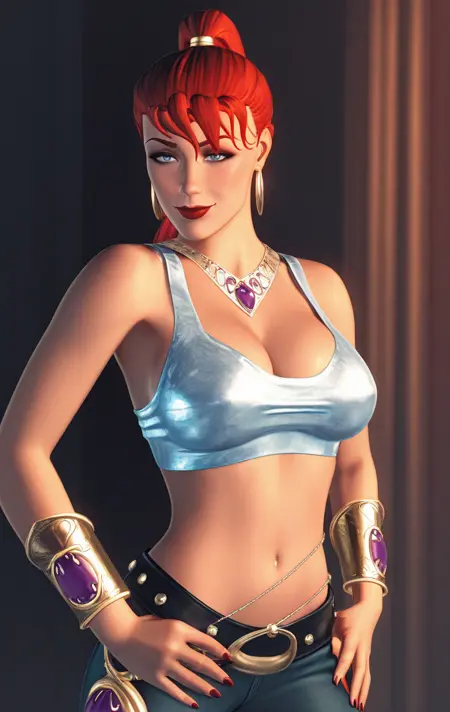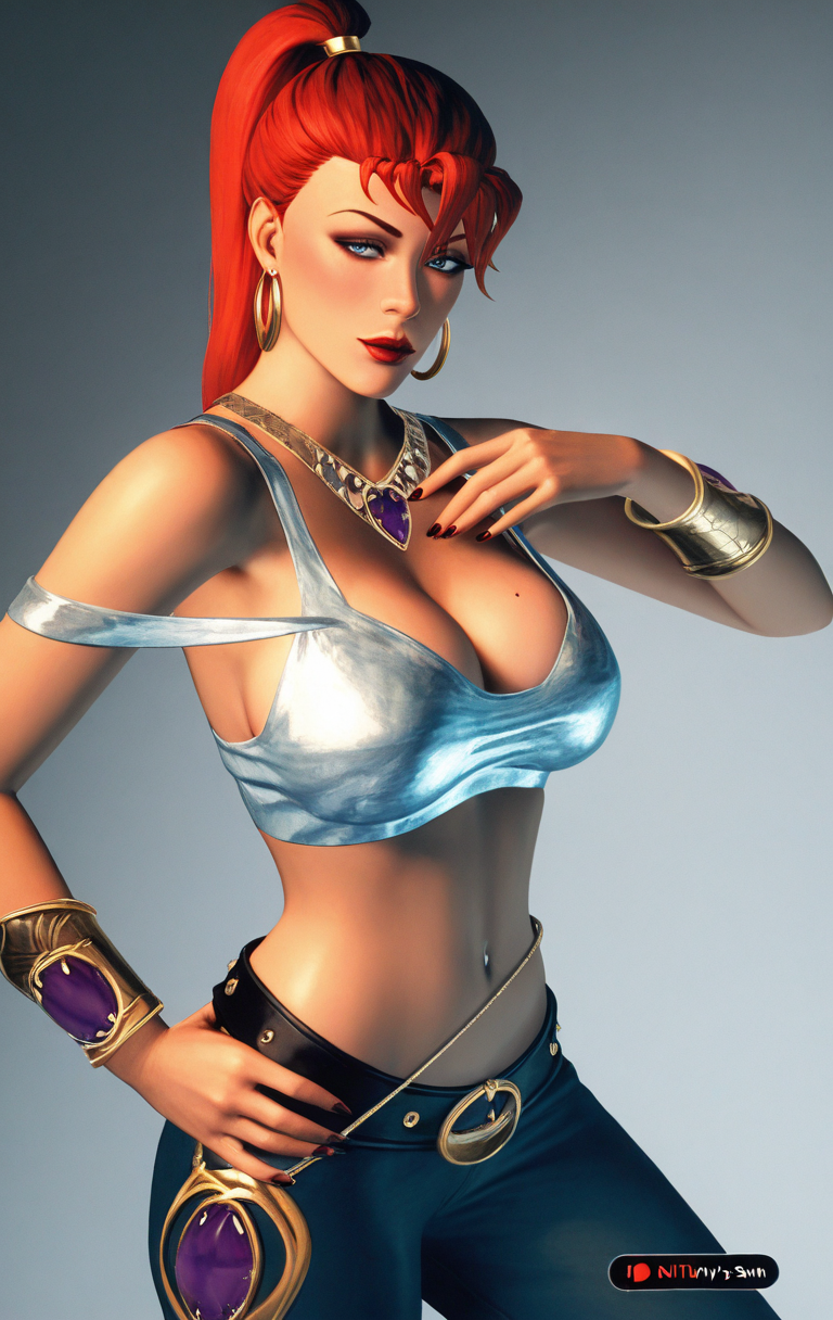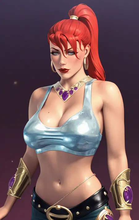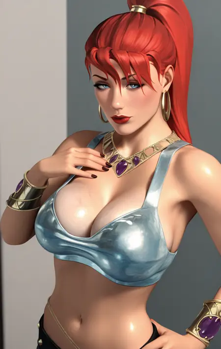 | Trained Words | n1kk1x, 1girl, solo, breasts, looking at viewer, smile, large breasts, navel, cleavage, jewelry, bare shoulders, twintails, medium breasts, standing, blue eyes, ponytail, red hair, earrings, red lips, stomach, necklace, bracelet, nail polish, crop top, fingernails, black nails, lips, colored skin, colored sclera, piercing, armlet, pendant, bandages, piercing on breast, bandaged arm, purple gemstone, asymmetrical hair, contrapposto, purple armletCopied! |