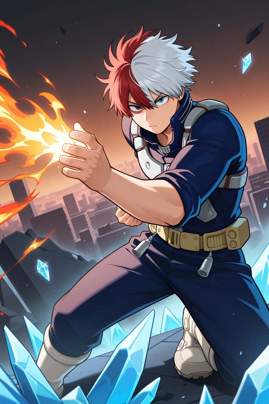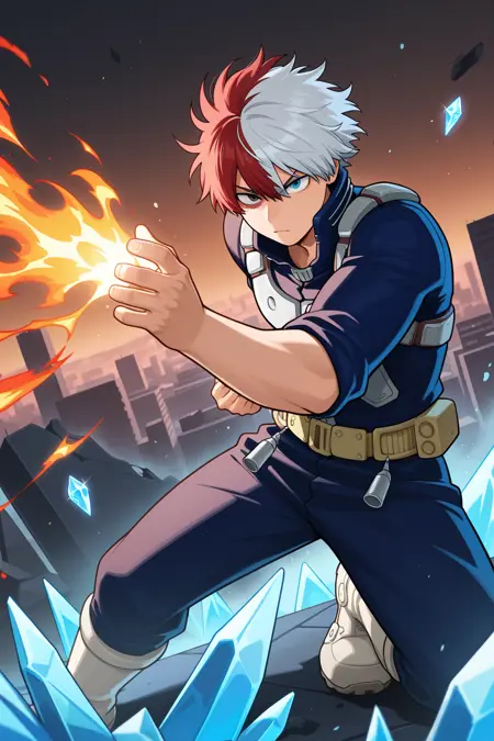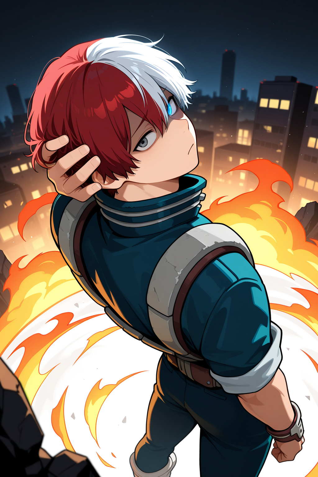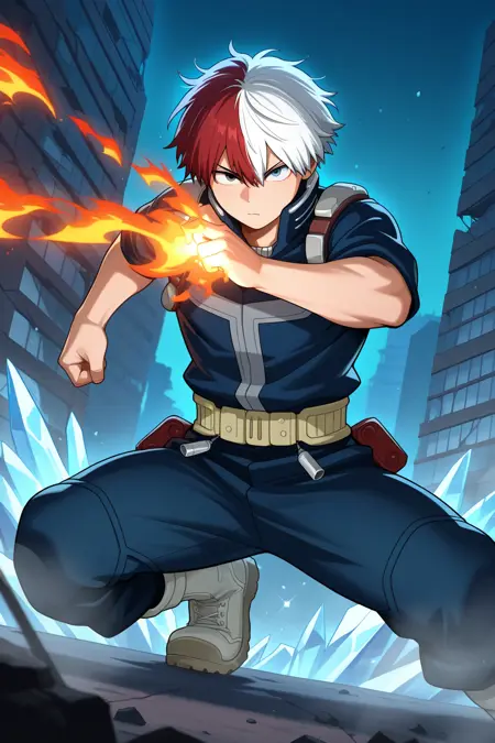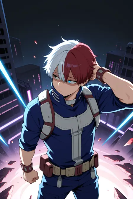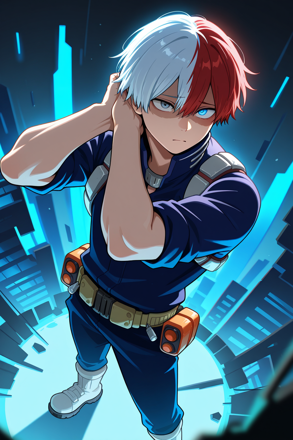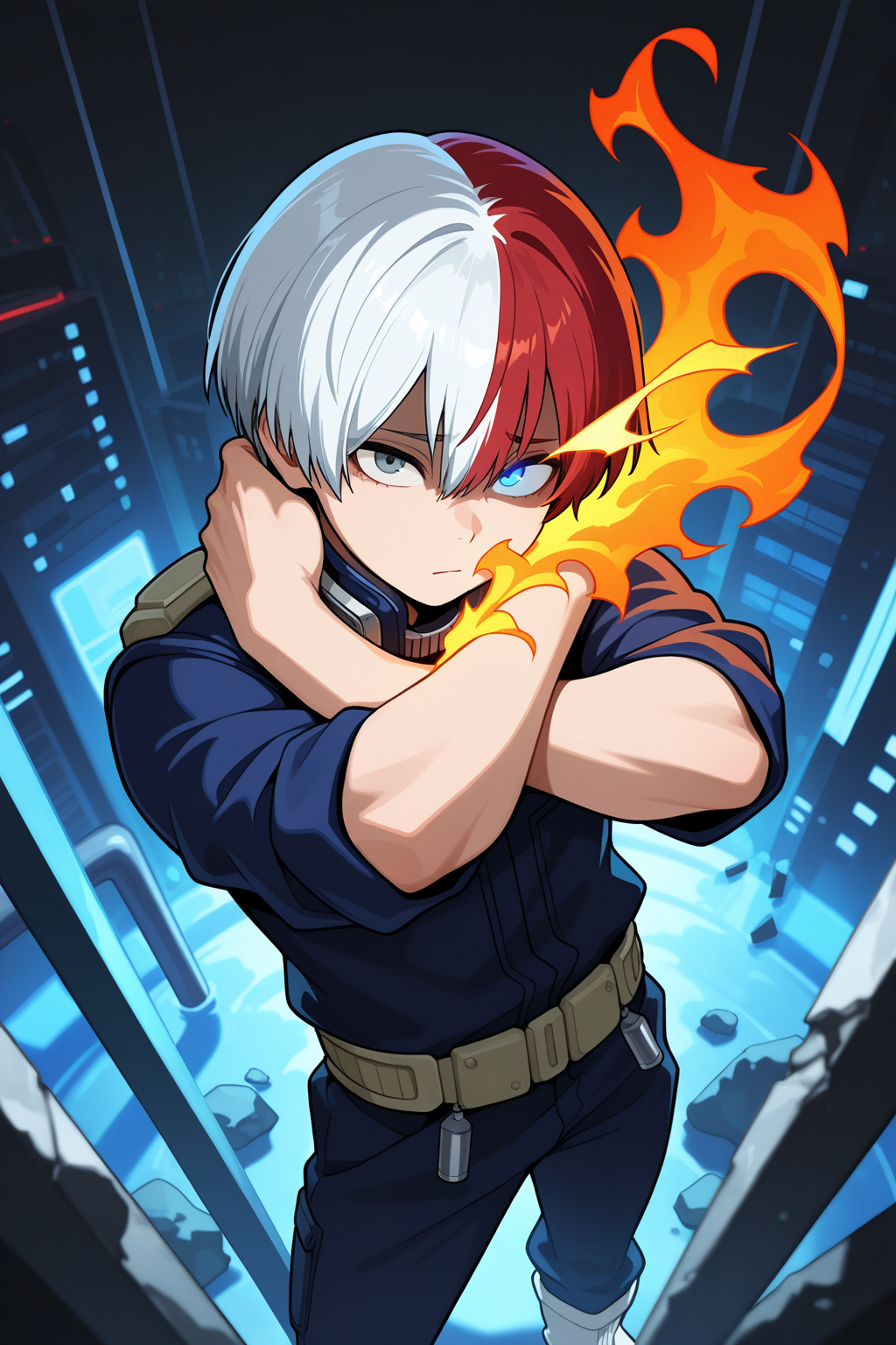 Todoroki_Shotoo, blue eyes, burn scar, split-color hair, white hair, red hair, heterochromia, grey eyes, blue eyes, hair between eyes, hero suit, jumpsuit, white boots, blue pants, utility belt,