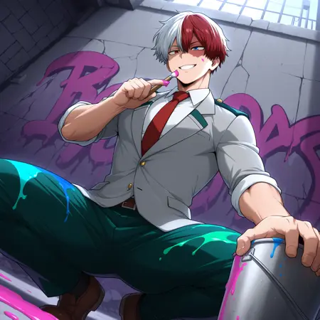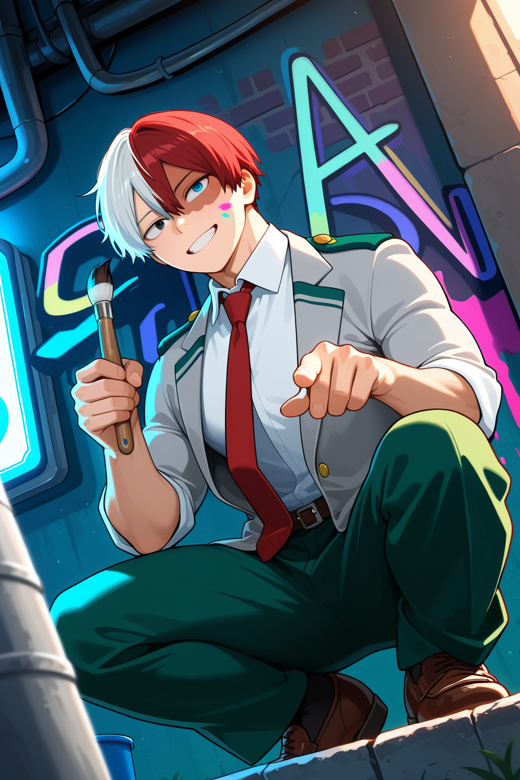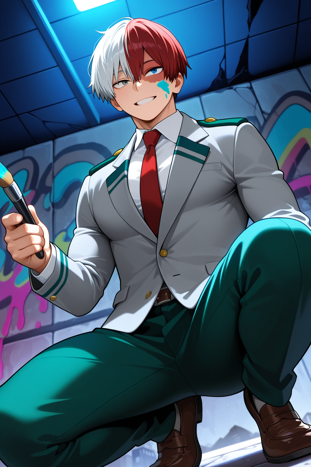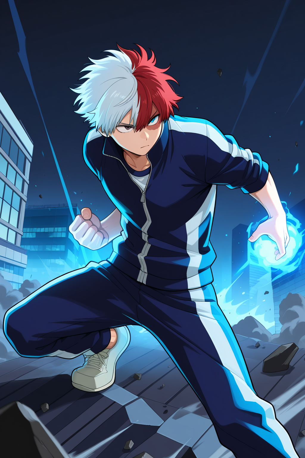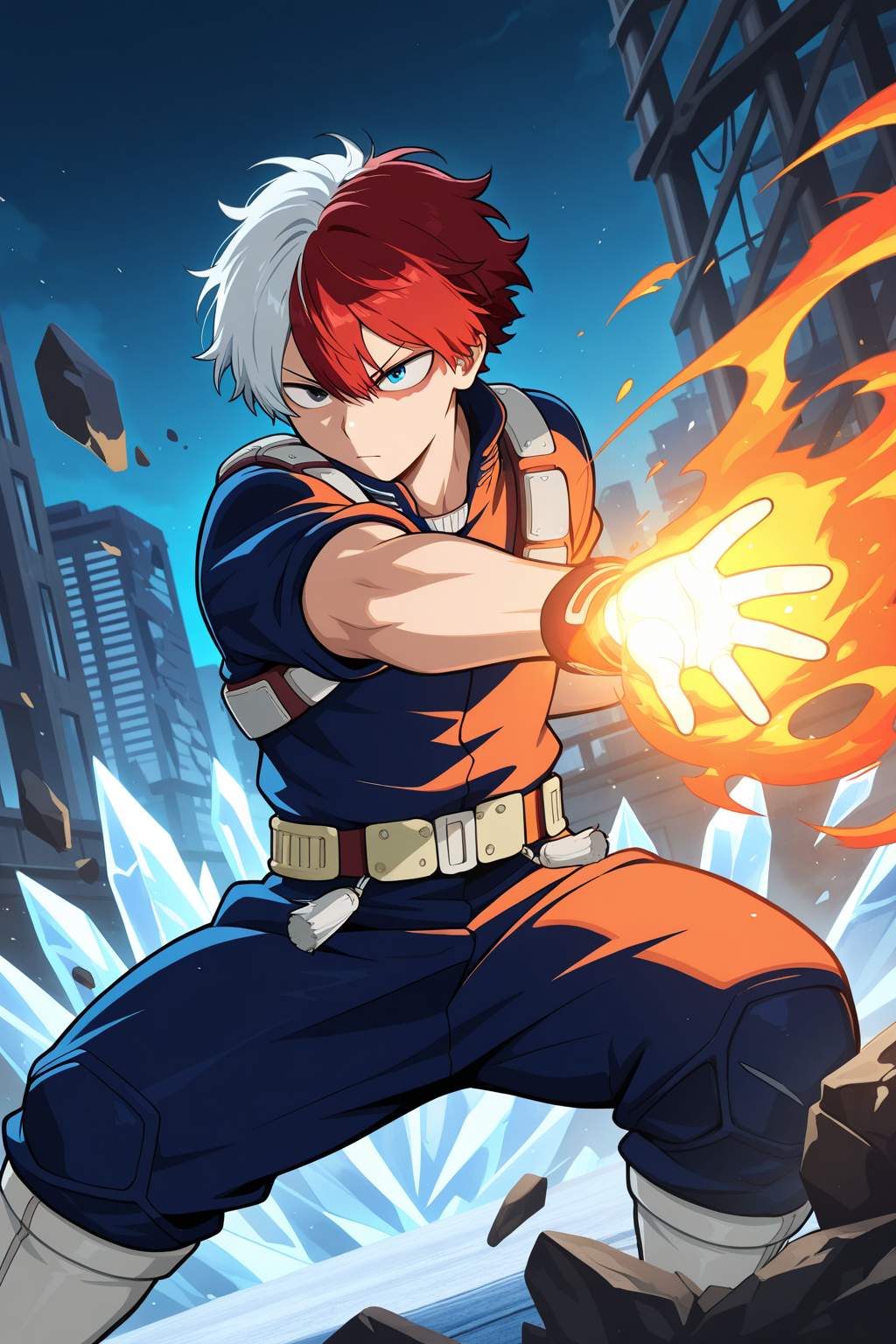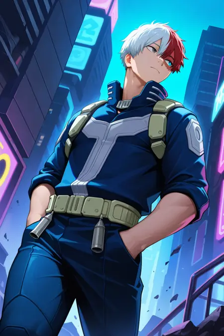 Todoroki_Shotoo, blue eyes, burn scar, split-color hair, white hair, red hair, heterochromia, grey eyes, blue eyes, hair between eyes, hero suit, jumpsuit, white boots, blue pants, utility belt,