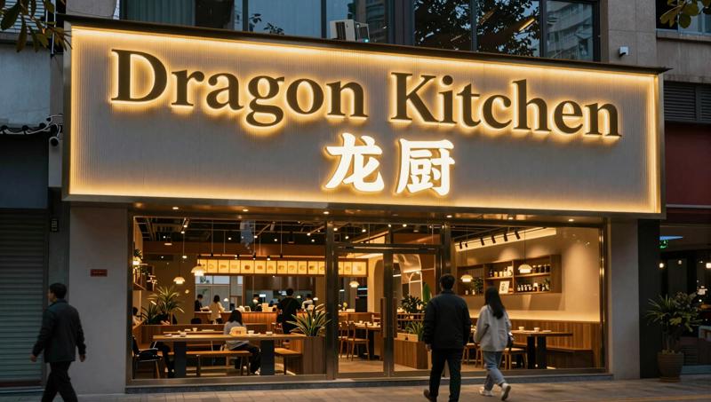 夜晚的现代融合餐厅外观。入口上方有大型发光招牌,英文“Dragon Kitchen”以优雅手写体呈现,下方为传统中文“龙厨”。两组文字均散发温暖金色光芒。现代玻璃立面门店,内部灯光可见。城市街道背景,行人穿梭。双语文字完美渲染,专业招牌设计。夜间摄影,氛围感强,色彩鲜明。