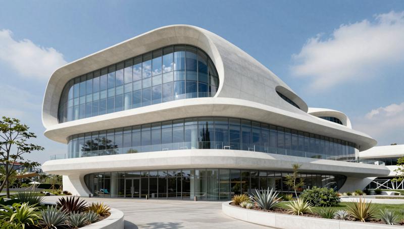 惊艳的当代建筑:白色混凝土建筑,曲线有机造型。落地玻璃窗映出蓝天与白云。极简现代设计,干净几何线条。四周环绕种植本土植物的景观花园。低角度拍摄,突出建筑高度与戏剧感。明亮日光,高对比阴影。专业建筑摄影,超清晰对焦,获奖级构图。
